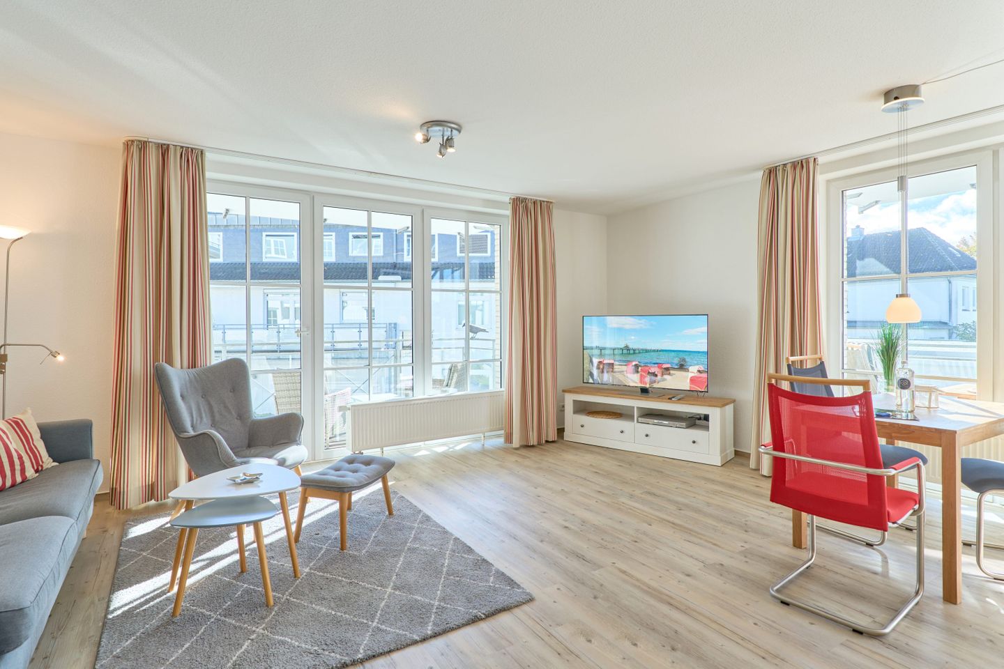 Das 60 m² große 2-Zimmer-Apartment in der ersten Etage bietet Platz für bis zu 2 Personen und ist modern und geschmackvoll eingerichtet. Der Wohnbereich verfügt über ein komfortables Sofa, einen bequemen Fernsehsessel mit Hocker für entspannte Fernsehabende, sowie einen Flatscreen-TV und eine gut ausgestattete Küche mit Essbereich.