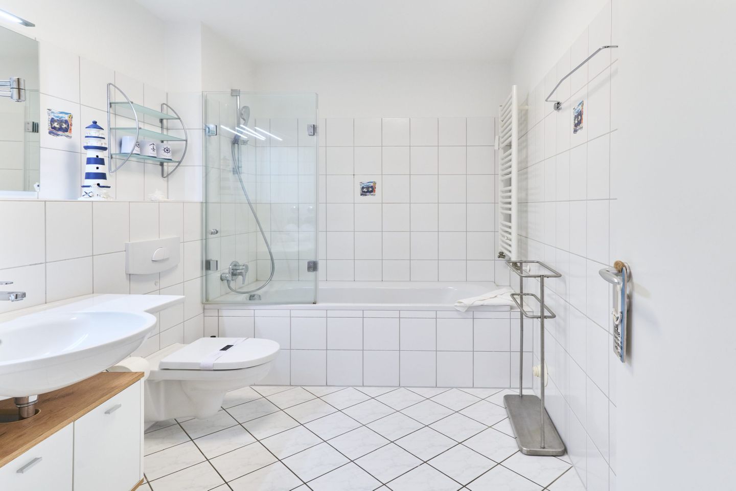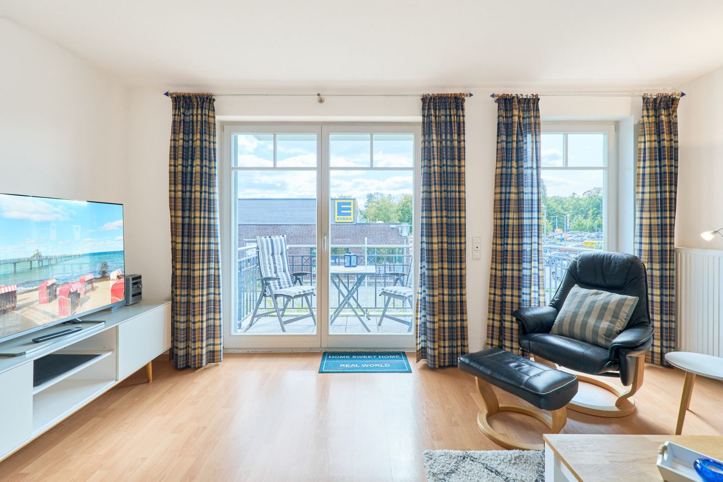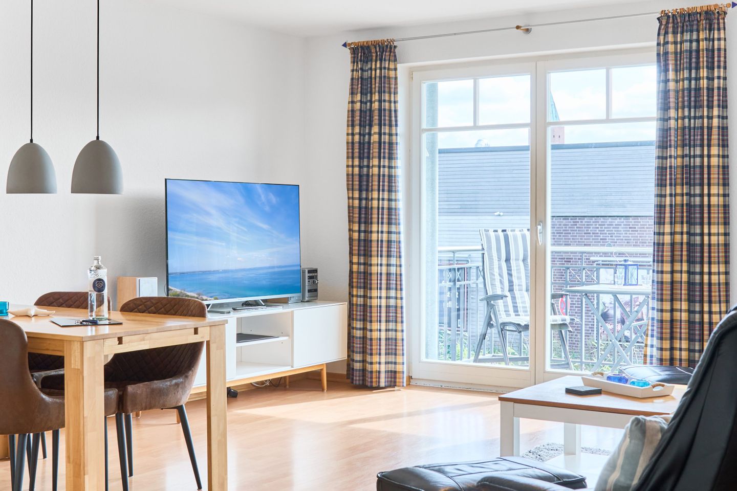 Die 60 m² große Ferienwohnung Ap. B 13 liegt in der 1. Etage und ist ideal für bis zu 2 Personen. Sie bietet einen großzügigen Wohnbereich mit einer bequemen Sitzgruppe, einem Farb-TV und einer Stereoanlage. Die voll ausgestattete Einbauküche verfügt über einen Geschirrspüler, Mikrowelle und eine gemütliche Sitzecke. Vom Wohnbereich aus gelangen Sie auf den südlich ausgerichteten Balkon, auf dem Sie entspannte Stunden genießen können.