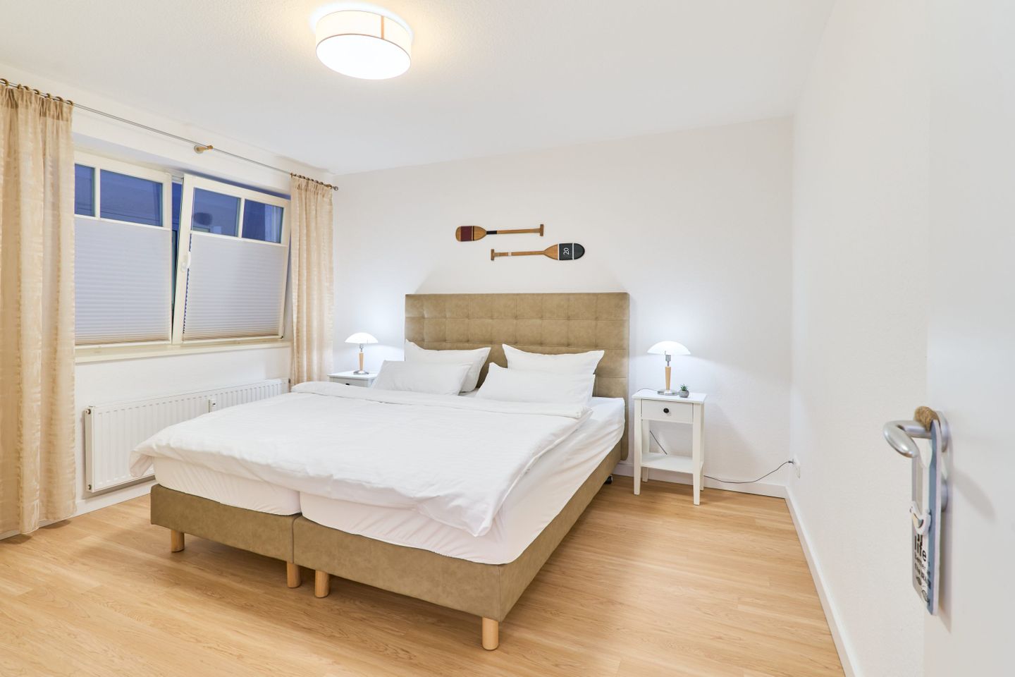 Das Schlafzimmer ist mit einem komfortablen Boxspringbett (2x 90 cm x 200 cm) ausgestattet, während das hell geflieste Badezimmer mit Badewanne, WC, Fön und einem Handtuchwärmer für Wohlfühlatmosphäre sorgt.