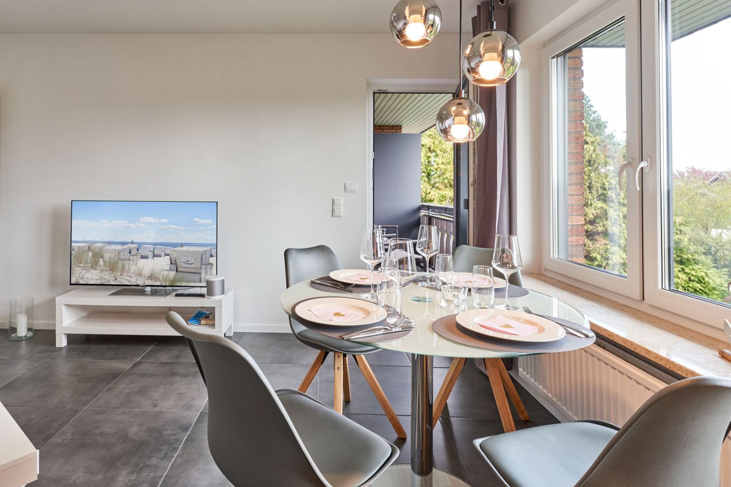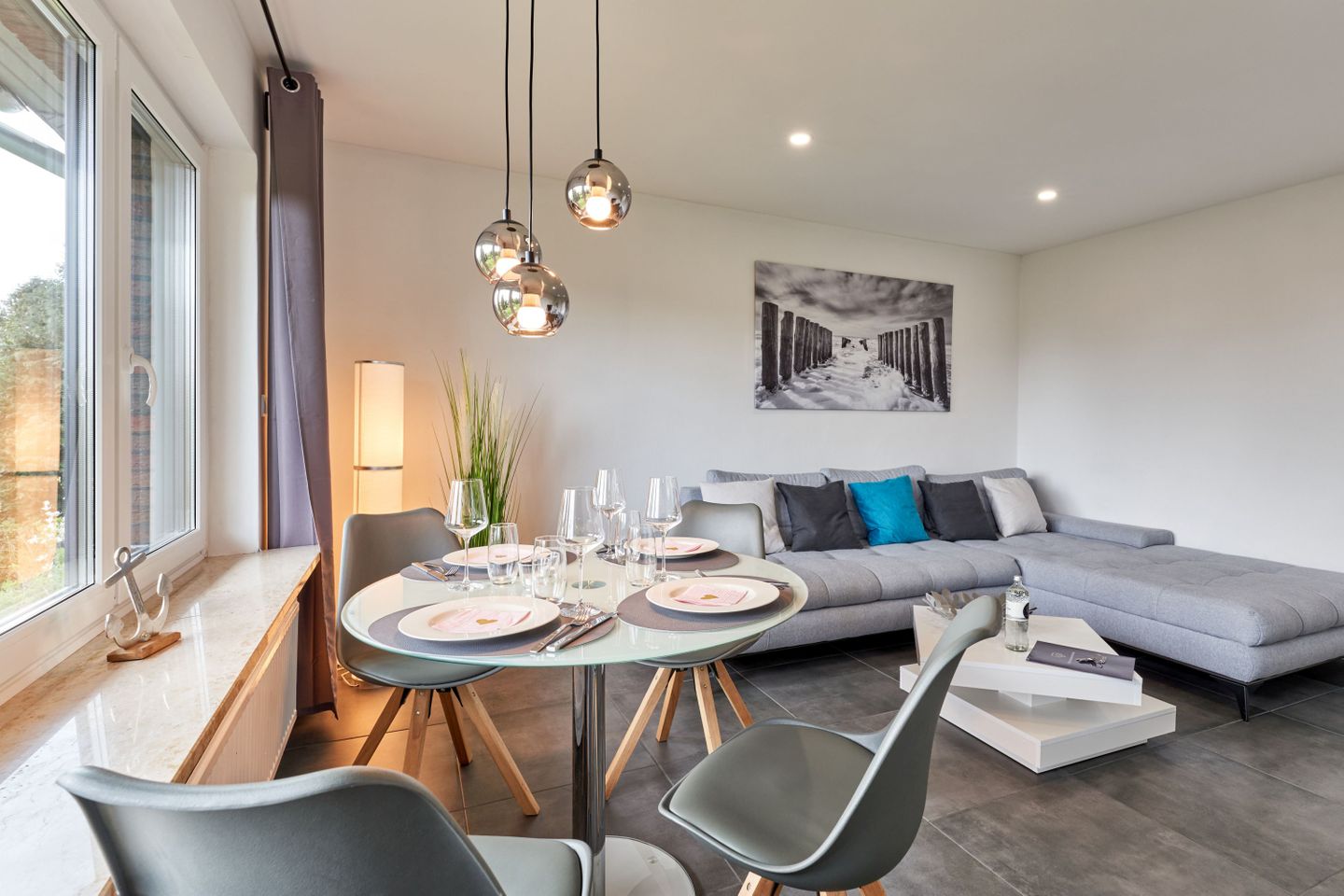 650m bis zum Meer – wer will da nicht sofort loslaufen? Unsere 65qm große Wohnung befindet sich im 1. Obergeschoss und hat einen schönen Wohnbereich mit einer Wohnlandschaft und einem Esstisch für 4 Personen. Der direkte Zugang zum Sonnenbalkon bietet viel Licht und einen großartigen Blick bis zum Meer.