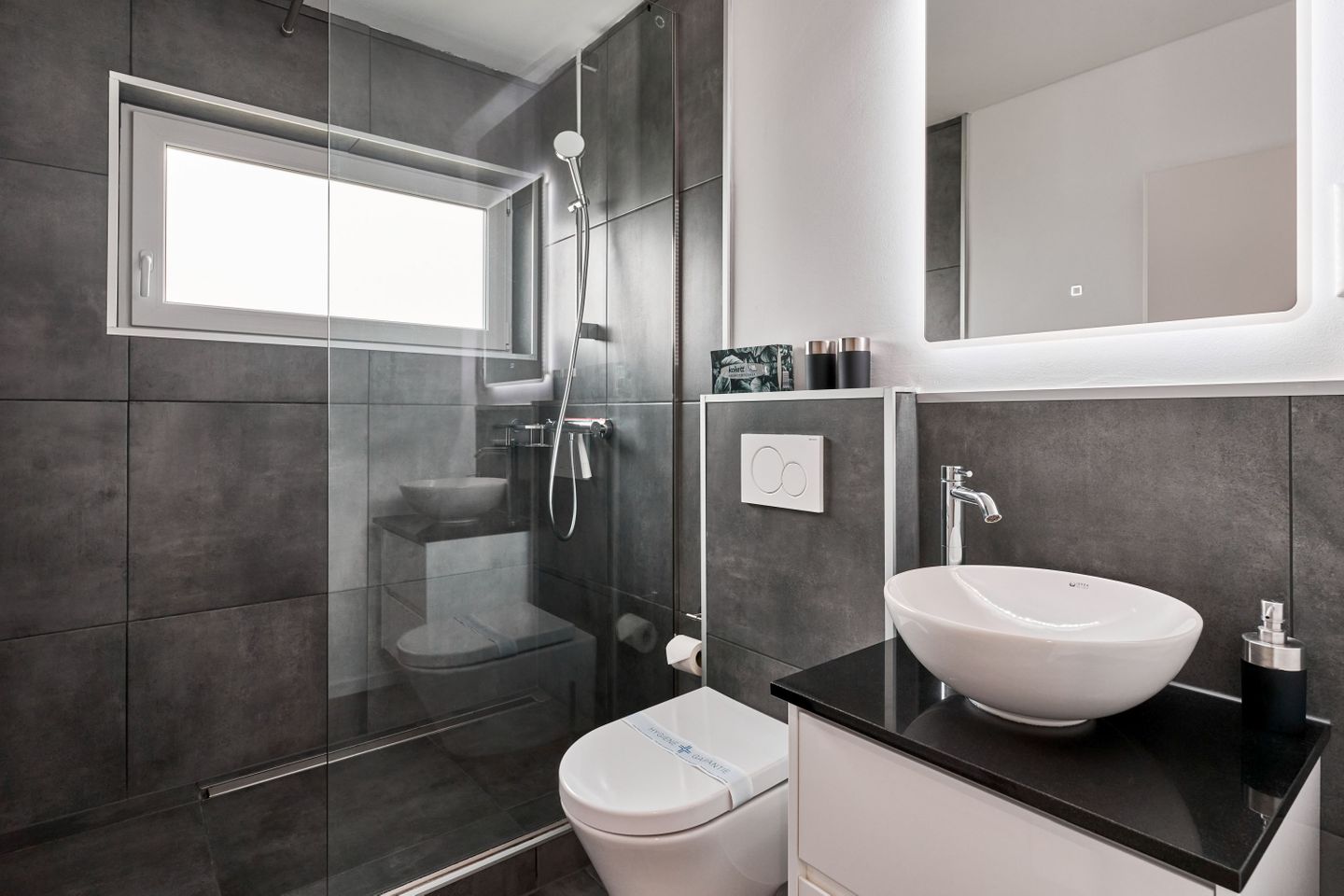 Das Badezimmer ist mit einer bodentiefen Dusche und einem Tageslichtfenster ausgestattet.