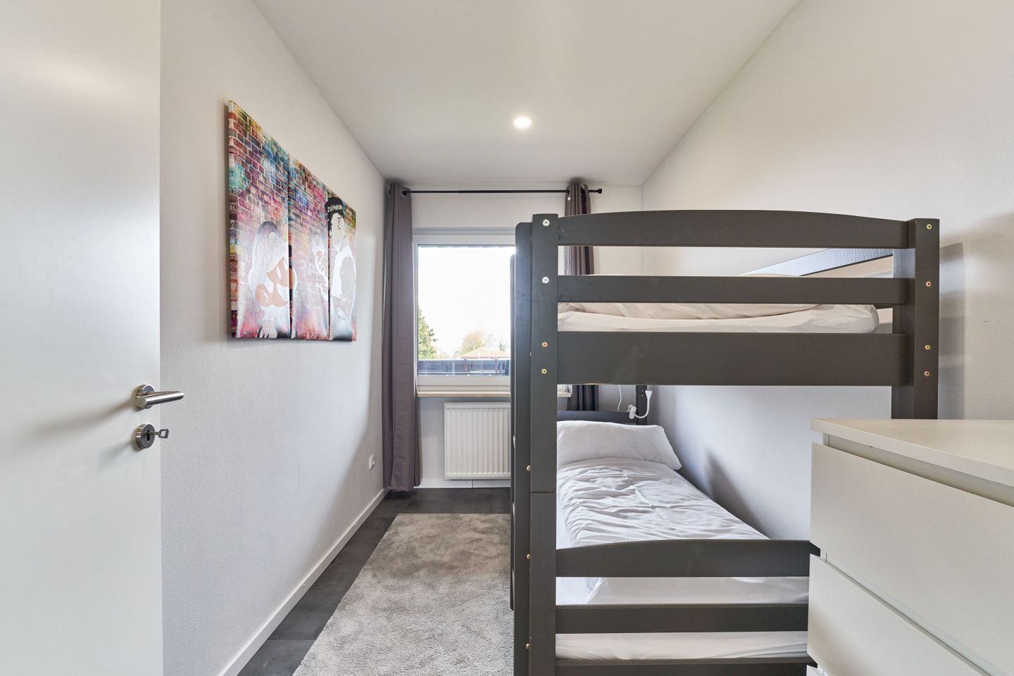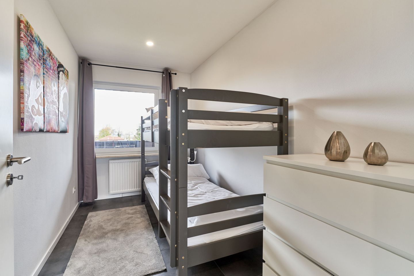 Das Masterschlafzimmer verfügt über eine komfortables Boxspringbett (180x200cm), das Ihnen einen ruhigen und erholsamen Schlaf während Ihres Aufenthalts schenken wird. Im Kinderschlafzimmer ist ein Etagenbett (90x200cm) und schafft einen eigenen Bereich für schöne Träume nach einem Strandtag. Sollten Sie ein Kinderreisebett und einen Hochstuhl benötigen, so können Sie dieses bei Ihrer Buchung direkt dazubuchen.