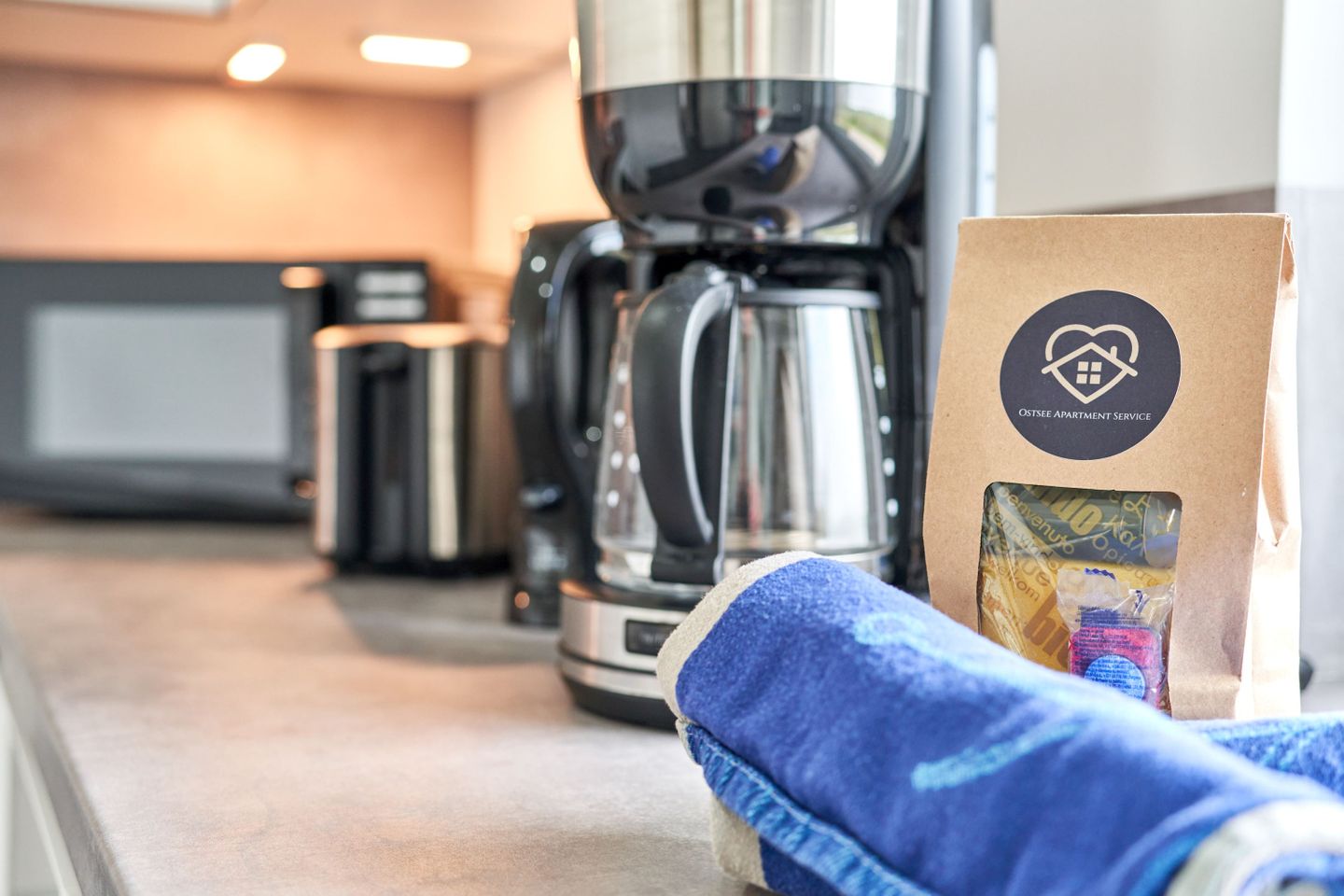 Diese beinhaltet: eine Rolle Haushaltsküchenpapier, zwei Rollen Toilettenpapier, eine kleine Flasche Spülmittel, eine Mülltüte, ein Spülschwamm, ein Spültuch, eine Handseife, zwei Geschirrhandtücher und 3 Geschirrspültabs (sofern ein Geschirrspüler zur Ausstattung der Unterkunft gehört).