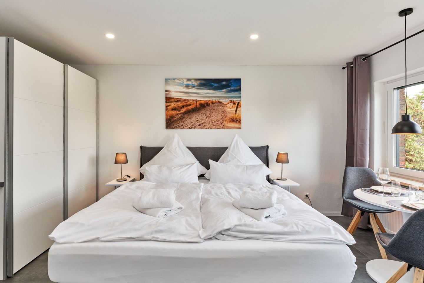 Nach einem ereignisreichen Strandtag finden Sie im komfortablen Boxspringbett (180x200cm) die benötigte Ruhe und einen erholsamen Schlaf. Bitte beachten Sie, dass Wäschepakete nicht enthalten sind, sie können jedoch optional hinzu gebucht werden.