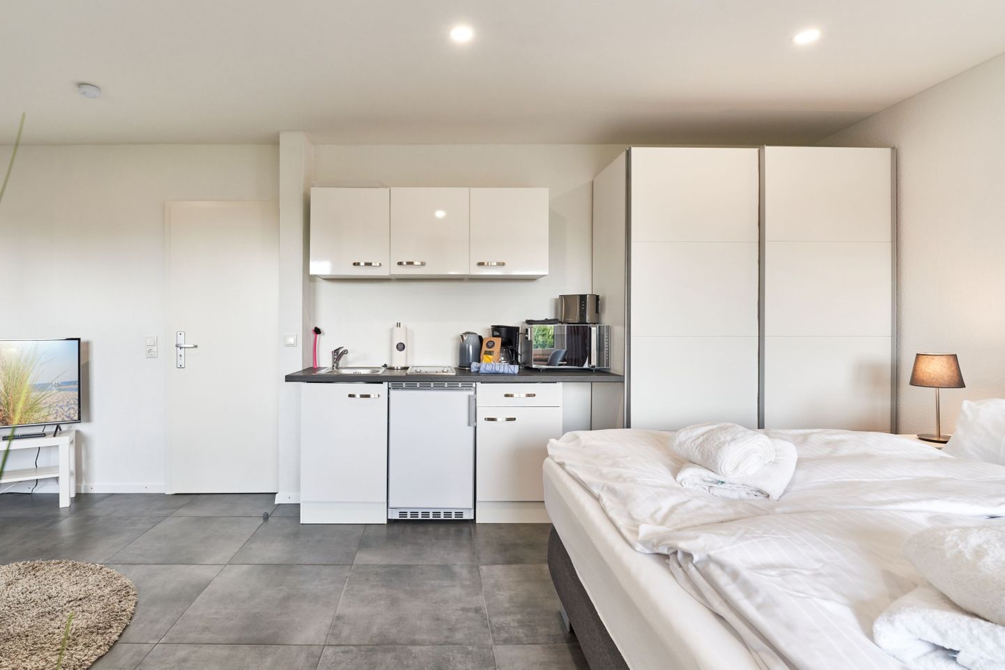 Das Apartment ist 35qm groß und verfügt über einen schönen Wohn-Schlafbereich mit einer kleinen Küchenzeile. Ein separates Badezimmer mit bodentiefer Dusche gehört ebenfalls zur Wohnung. Bitte beachten Sie, dass das Badezimmer nicht en suite ist. Das Badezimmer muss über einen Gemeinschaftsflur mit der Nachbarwohnung besucht werden. Die Türen sind aber direkt gegenüber. Die direkt angrenzende Wohnung ist durch eine Wohnungstür vom Flur getrennt. Somit ist Ihre Privatsphäre gesichert.