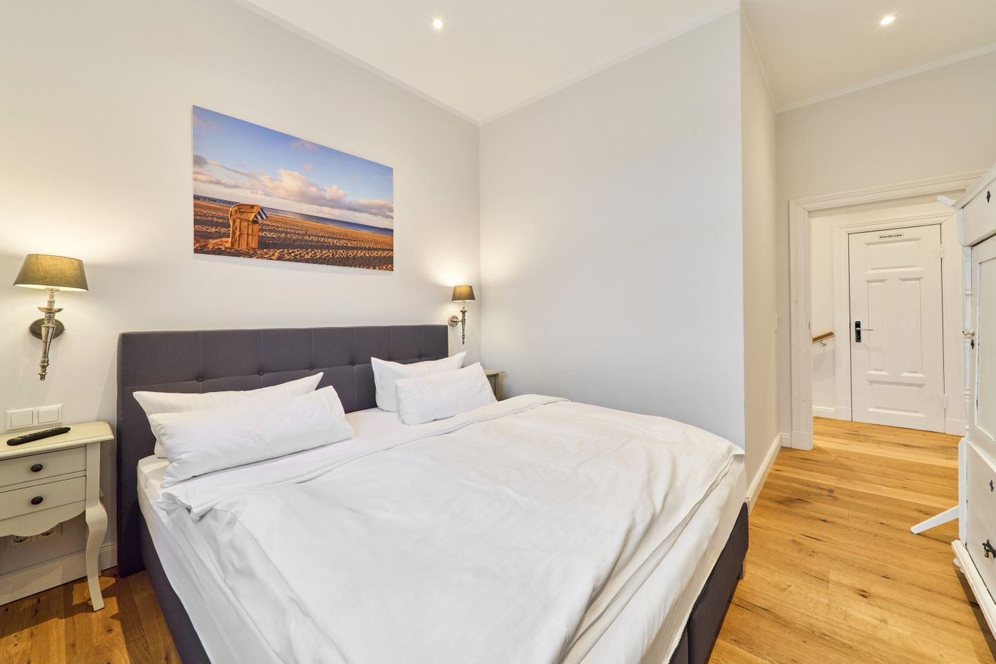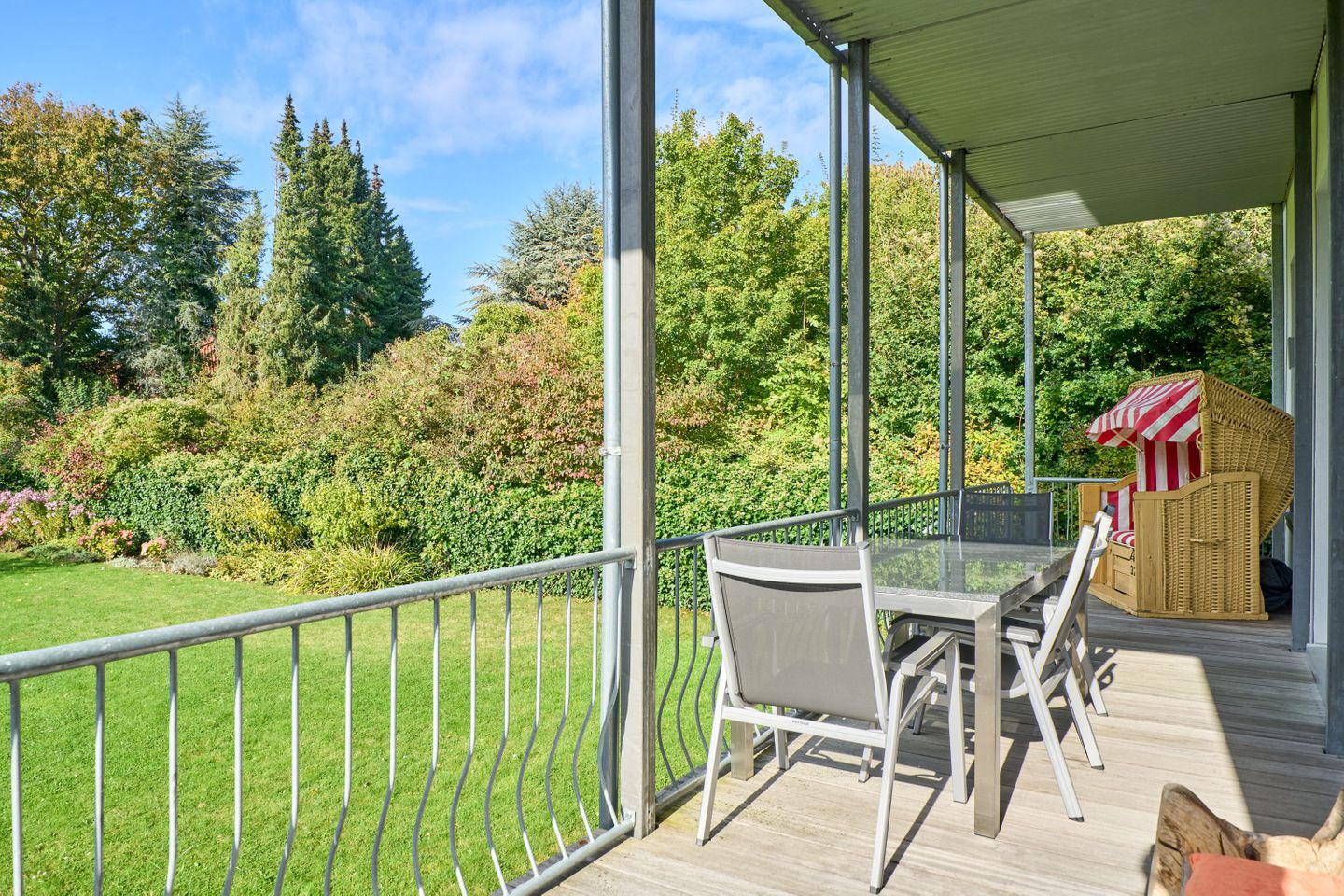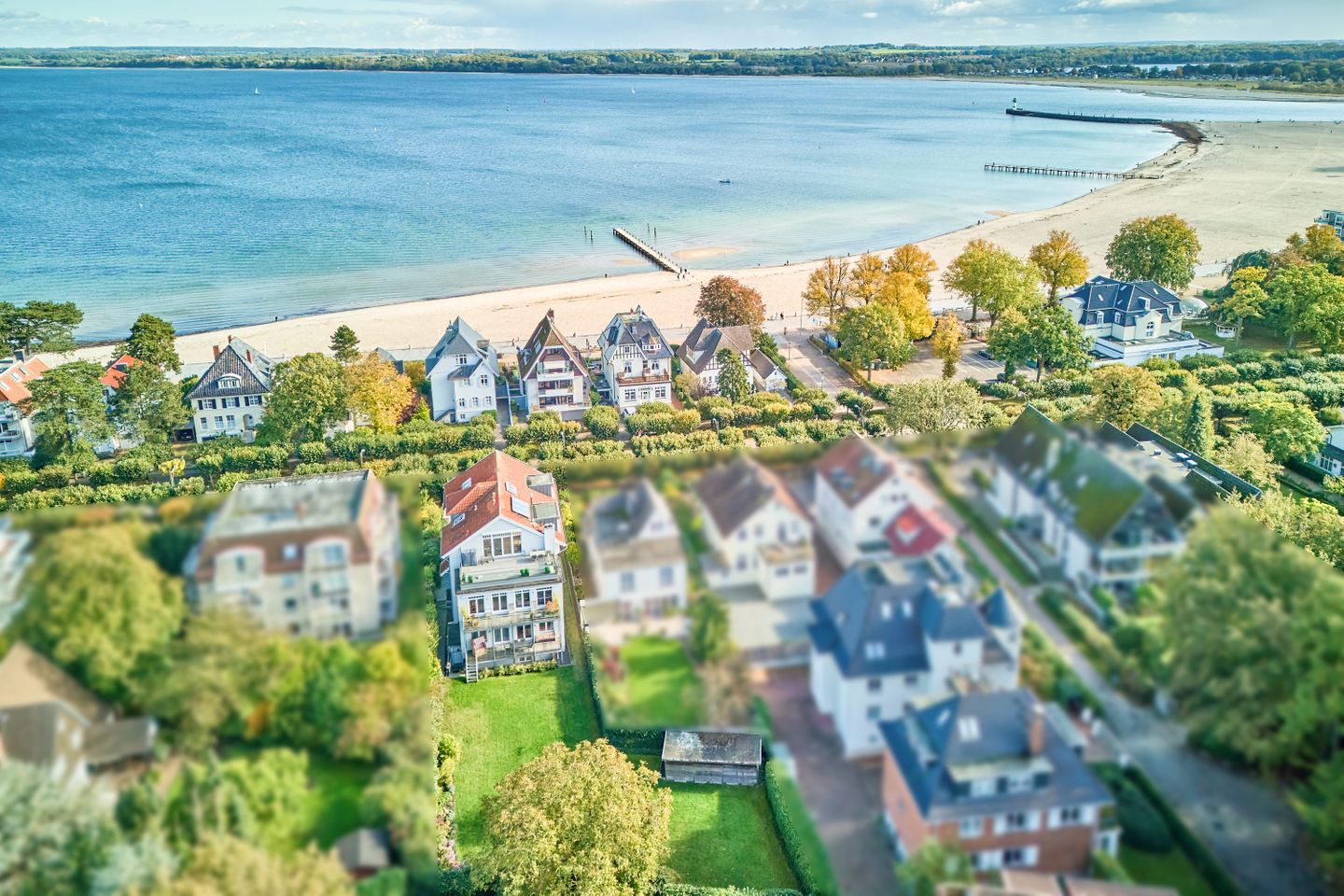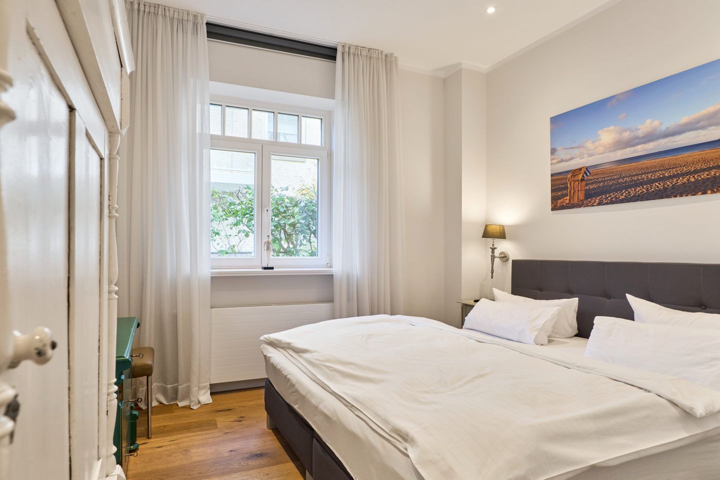 Villa Daheim Travemünde – Luxus pur in der Kaiserallee 35. Auf 105 m² bietet die Ferienwohnung Villa Daheim alles, was man sich für einen entspannten Urlaub an der Ostsee wünscht. Die luxuriöse Ferienwohnung liegt in der ruhigen zweiten Reihe an der Kaiserallee, nur 50 m vom Ostseestrand entfernt. Das Zentrum von Travemünde ist in etwa 15 Gehminuten über die Promenade erreichbar. Die Wohnung befindet sich in einer stilvollen Bäderstil-Villa, die kürzlich kernsaniert und modern eingerichtet wurde. Mit drei Zimmern, zwei Schlafzimmern, einer großzügigen Veranda und einer voll ausgestatteten Küche bietet die Wohnung Platz für bis zu vier Gäste. Große bodentiefe Fenster im Wohnzimmer sorgen für eine helle Atmosphäre und der Zugang zur sonnigen, südlich ausgerichteten Veranda mit Blick ins Grüne lädt zum Entspannen ein. Ein privater Strandkorb auf der Veranda sowie der Zugang zum Gemeinschaftsgarten sorgen für zusätzliche Erholung. In beiden Schlafzimmern stehen komfortable Boxspring-Doppelbetten und ausreichend Stauraum in den Kleiderschränken zur Verfügung. Das Badezimmer bietet eine Badewanne, Dusche und WC. Eine Waschmaschine zur freien Nutzung befindet sich im Waschkeller. Für Unterhaltung sorgen ein großer LED-TV mit Kabelanschluss im Wohnzimmer, ein weiterer TV im Schlafzimmer sowie eine Stereoanlage mit Radio und CD-Funktion. Die geschmackvolle und moderne Einrichtung auf 105 m² lässt keine Wünsche offen. Für Ihren Komfort ist ein privater Stellplatz direkt vor dem Haus vorhanden, und Ihre Fahrräder können sicher und trocken im eigenen Fahrradschuppen untergebracht werden. Villa Daheim in Travemünde bietet Luxus, modernes Ambiente und Altbaucharme in strandnaher Lage an der Kaiserallee und ist die perfekte Unterkunft für einen unvergesslichen Ostseeurlaub.