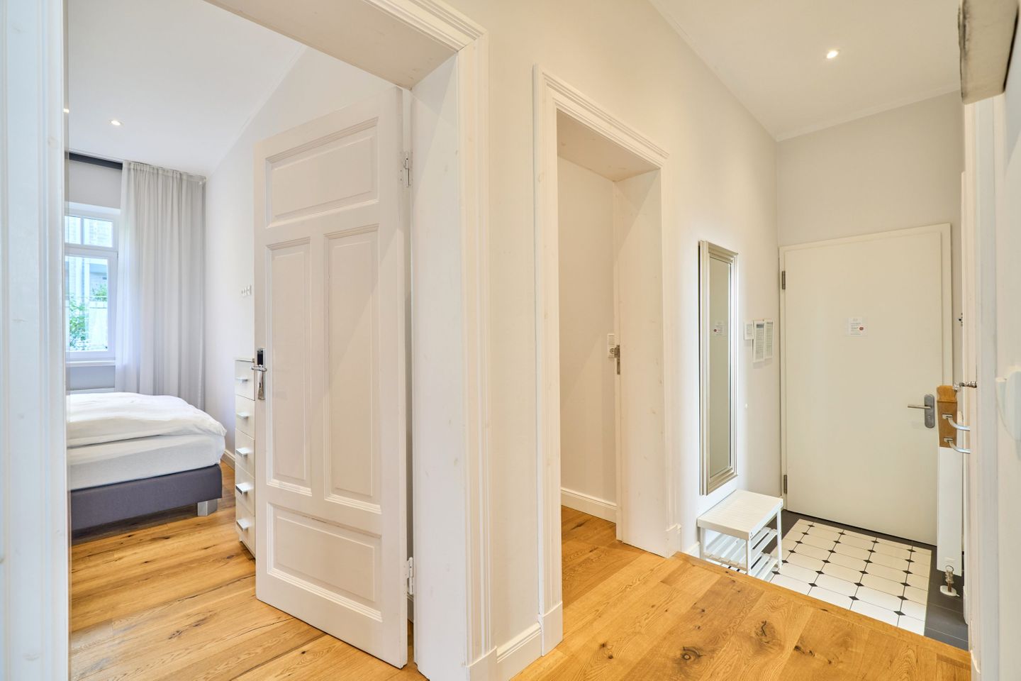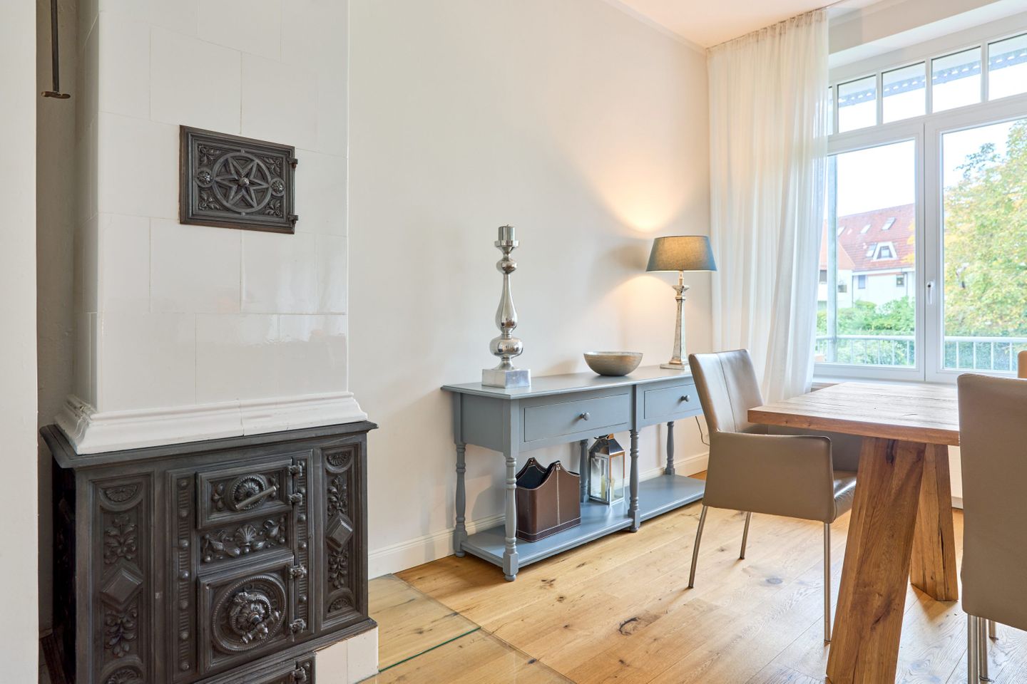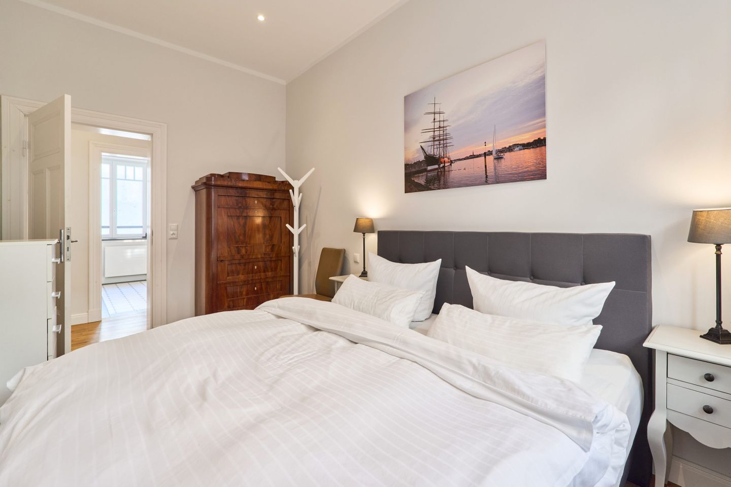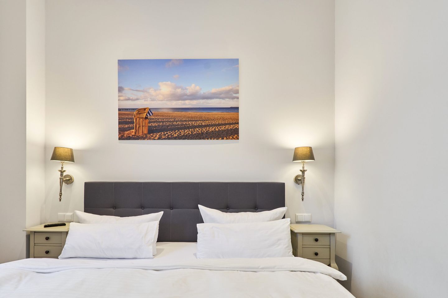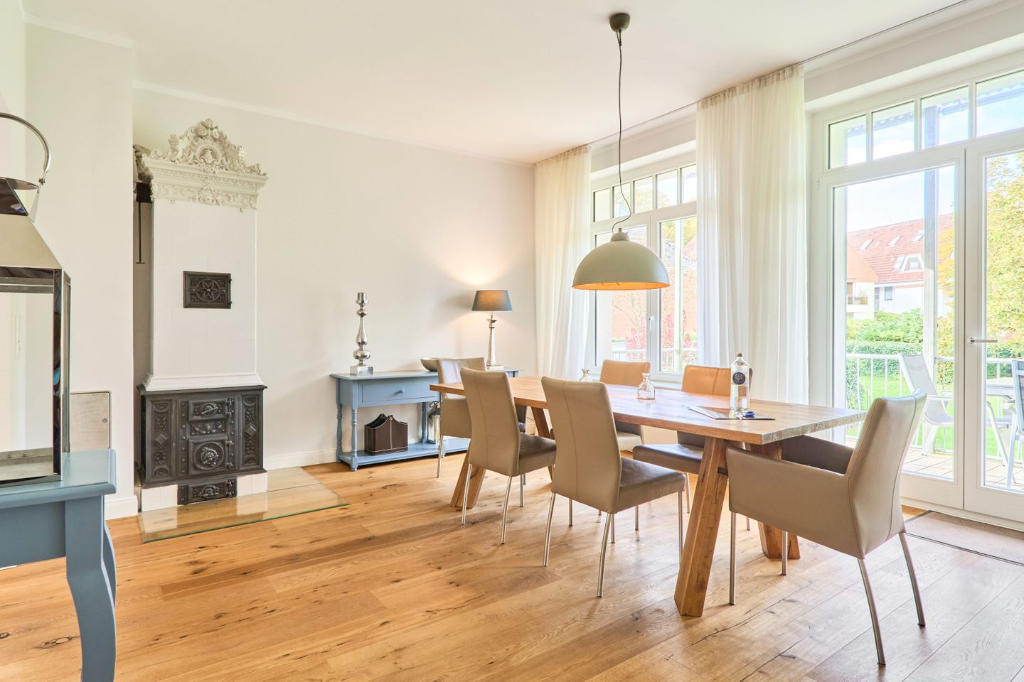 Villa Daheim Travemünde – Luxus pur in der Kaiserallee 35. Auf 105 m² bietet die Ferienwohnung Villa Daheim alles, was man sich für einen entspannten Urlaub an der Ostsee wünscht. Die luxuriöse Ferienwohnung liegt in der ruhigen zweiten Reihe an der Kaiserallee, nur 50 m vom Ostseestrand entfernt. Das Zentrum von Travemünde ist in etwa 15 Gehminuten über die Promenade erreichbar. Die Wohnung befindet sich in einer stilvollen Bäderstil-Villa, die kürzlich kernsaniert und modern eingerichtet wurde. Mit drei Zimmern, zwei Schlafzimmern, einer großzügigen Veranda und einer voll ausgestatteten Küche bietet die Wohnung Platz für bis zu vier Gäste. Große bodentiefe Fenster im Wohnzimmer sorgen für eine helle Atmosphäre und der Zugang zur sonnigen, südlich ausgerichteten Veranda mit Blick ins Grüne lädt zum Entspannen ein. Ein privater Strandkorb auf der Veranda sowie der Zugang zum Gemeinschaftsgarten sorgen für zusätzliche Erholung. In beiden Schlafzimmern stehen komfortable Boxspring-Doppelbetten und ausreichend Stauraum in den Kleiderschränken zur Verfügung. Das Badezimmer bietet eine Badewanne, Dusche und WC. Eine Waschmaschine zur freien Nutzung befindet sich im Waschkeller. Für Unterhaltung sorgen ein großer LED-TV mit Kabelanschluss im Wohnzimmer, ein weiterer TV im Schlafzimmer sowie eine Stereoanlage mit Radio und CD-Funktion. Die geschmackvolle und moderne Einrichtung auf 105 m² lässt keine Wünsche offen. Für Ihren Komfort ist ein privater Stellplatz direkt vor dem Haus vorhanden, und Ihre Fahrräder können sicher und trocken im eigenen Fahrradschuppen untergebracht werden. Villa Daheim in Travemünde bietet Luxus, modernes Ambiente und Altbaucharme in strandnaher Lage an der Kaiserallee und ist die perfekte Unterkunft für einen unvergesslichen Ostseeurlaub.