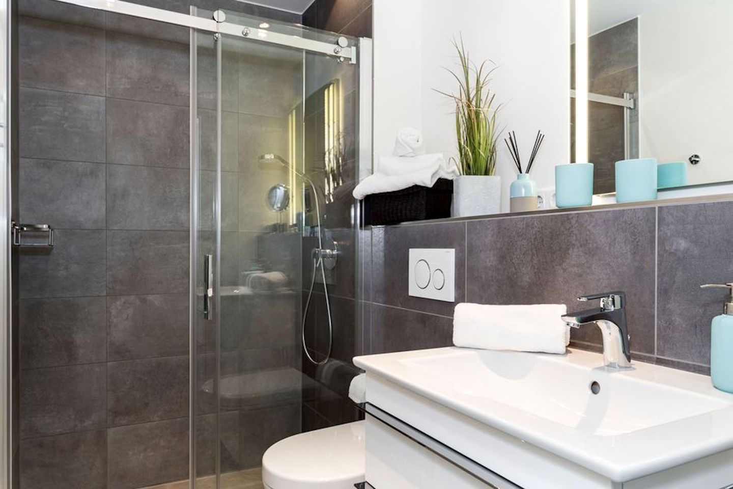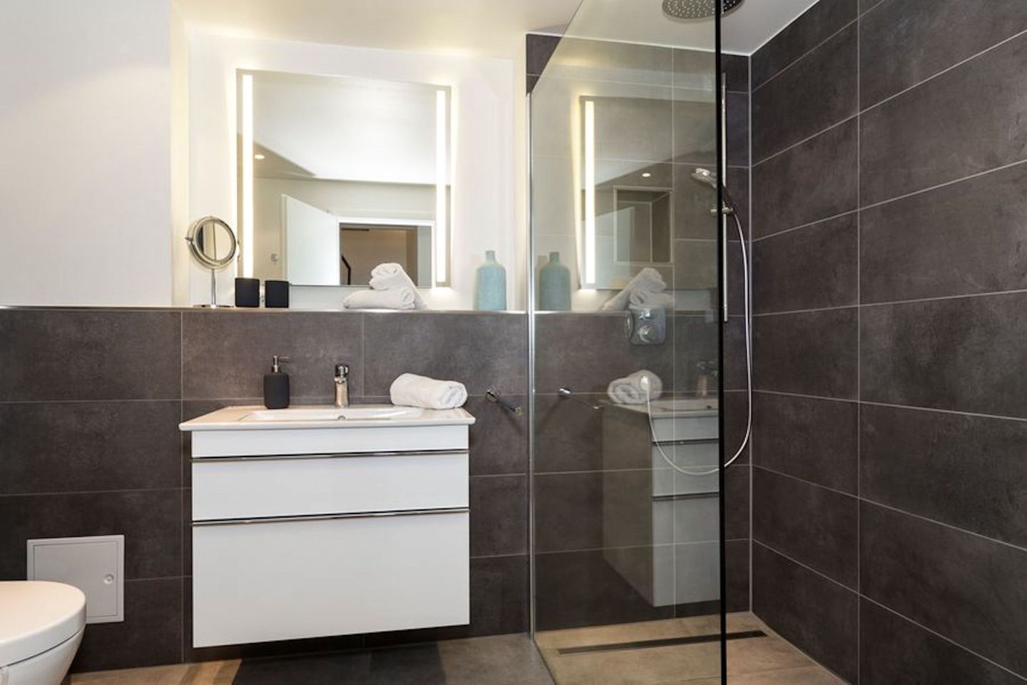 Beide Badezimmer sind komplett ausgestattet mit jeweils einer bodentiefen Dusche. Im Untergeschoss erwartet Sie eine "Rainshower-Dusche" zur Entspannung. Handtuchwärmer, Schminkspiegel und Föhn sowie eine Waschmaschine gehören zur Ausstattung.