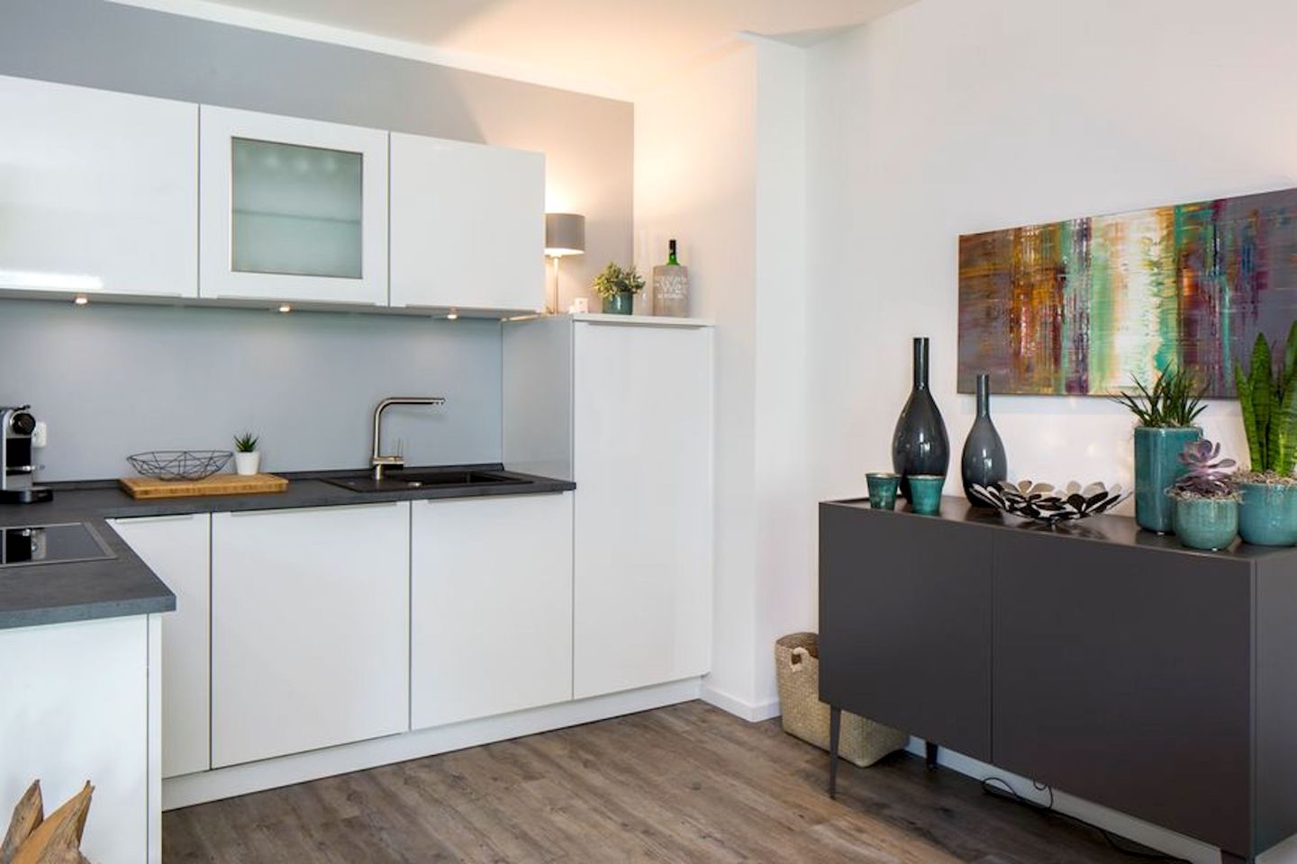Der große und helle Wohnbereich, mit gemütlicher Wohnlandschaft lädt zu entspannten Fernsehabenden mit unserem großen LCD Samsung Smart TV oder gemütlichen Abenden mit der gesamten Familie ein. Die moderne Nolte Küche ist offen gestaltet und in den Wohn- und Essbereich integriert und lässt für alle Hobbyköche keine Wünsche offen. Der große Kühlschrank hat reichlich Platz und mit unseren hochwertigen Töpfen, Messern, Geschirr und Besteck lässt sich jeden Tag ein wunderbares Menü zaubern. Kinderbesteck und ein Hochstuhl gehören natürlich zur Ausstattung, damit es auch den Kleinsten an nichts fehlt. Mit der Nespresso Maschine können Sie sich täglich eine Kaffeespezialität nach Ihren Wünschen zubereiten.