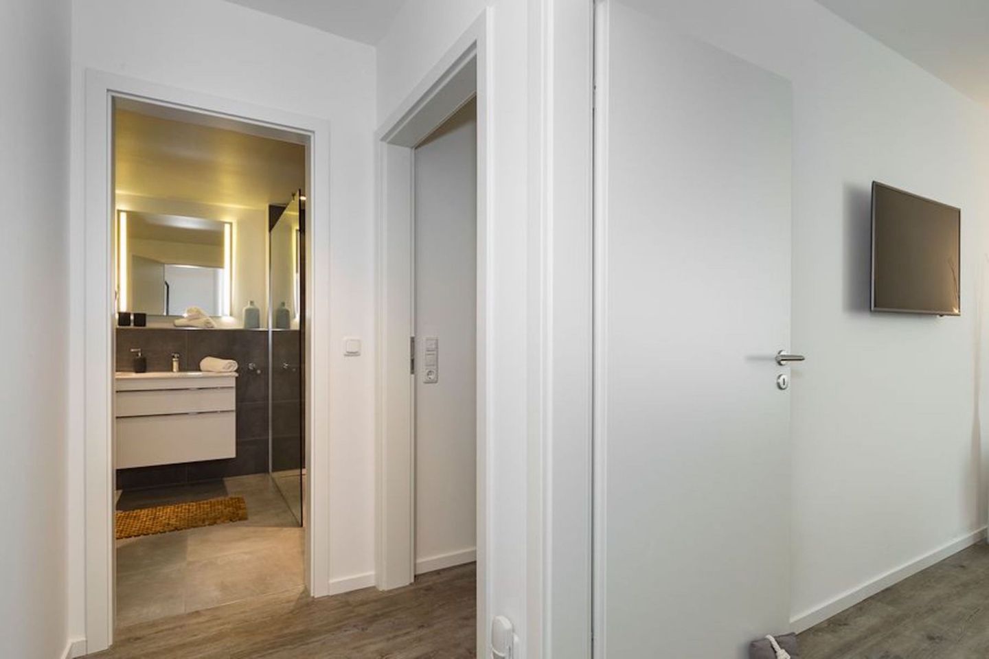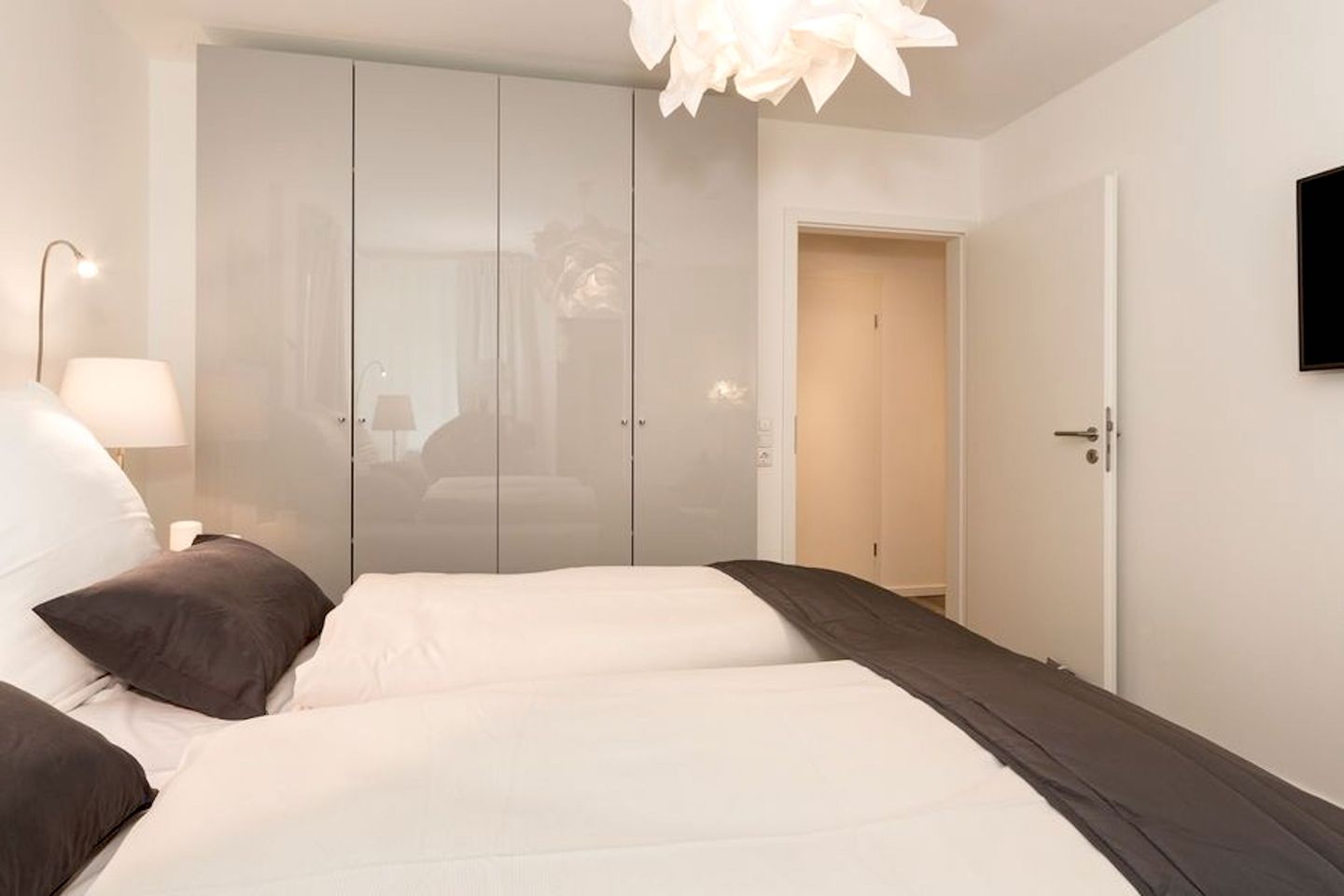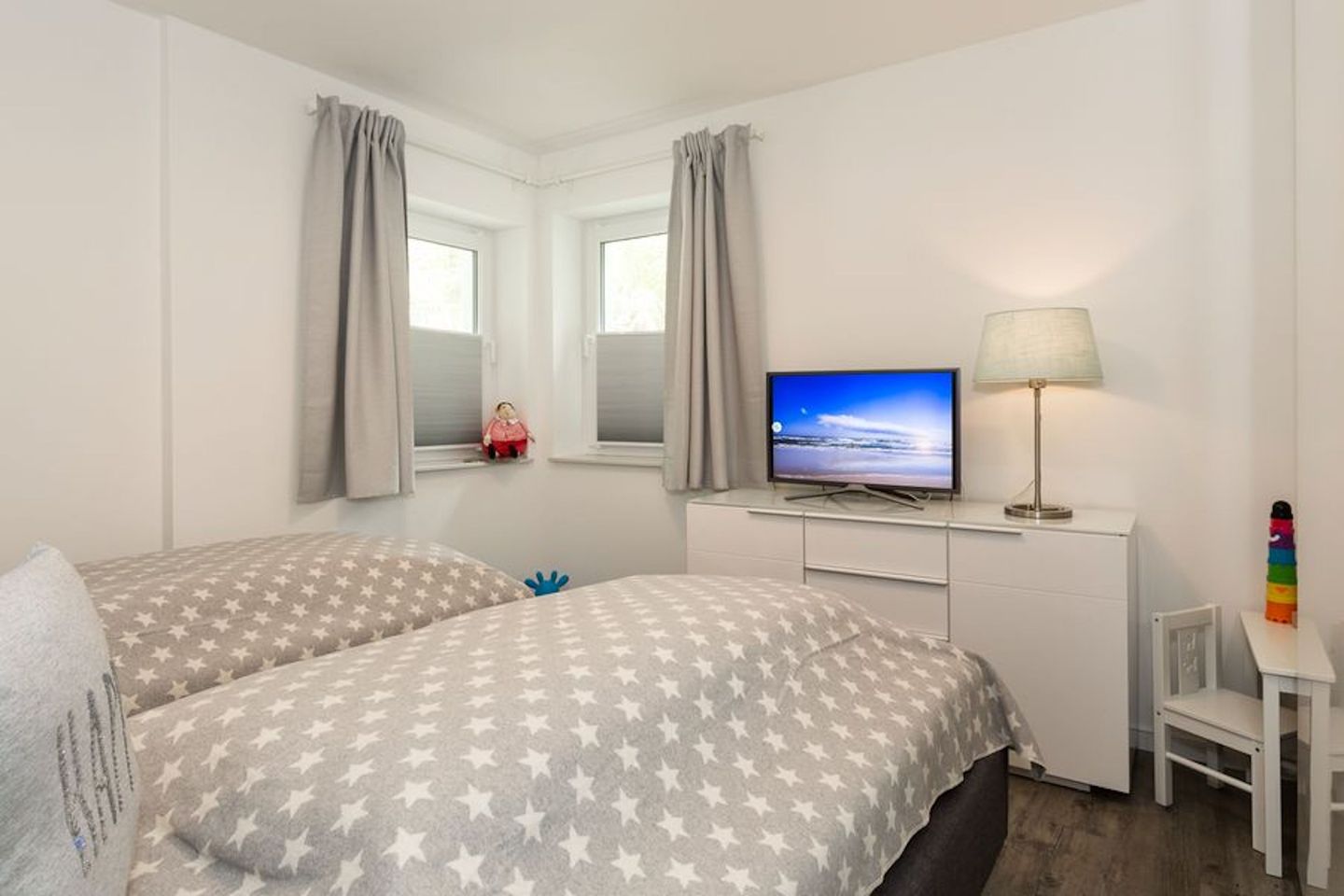 Nach einem tollen Tag am Strand können Sie sich in den zwei Schlafzimmern auf die hochwertigen und komfortablen Matratzen mit Geltex Technologie freuen. Das eine Schlafzimmer verfügt über ein Doppelbett (180x200) und das andere über zwei Einzelbetten (100x200), die auch nach Bedarf zusammengestellt werden können. Beide Schlafzimmer haben jeweils ein LCD Samsung Smart TV und es befinden sich entsprechende Verdunkelungsrollos vor den Fenstern, so dass einem erholsamen Schlaf nichts im Wege steht. Ein Baby Reisebett ist ebenfalls vorhanden, so dass auch die Kleinsten einen erholsamen Schlaf genießen können.