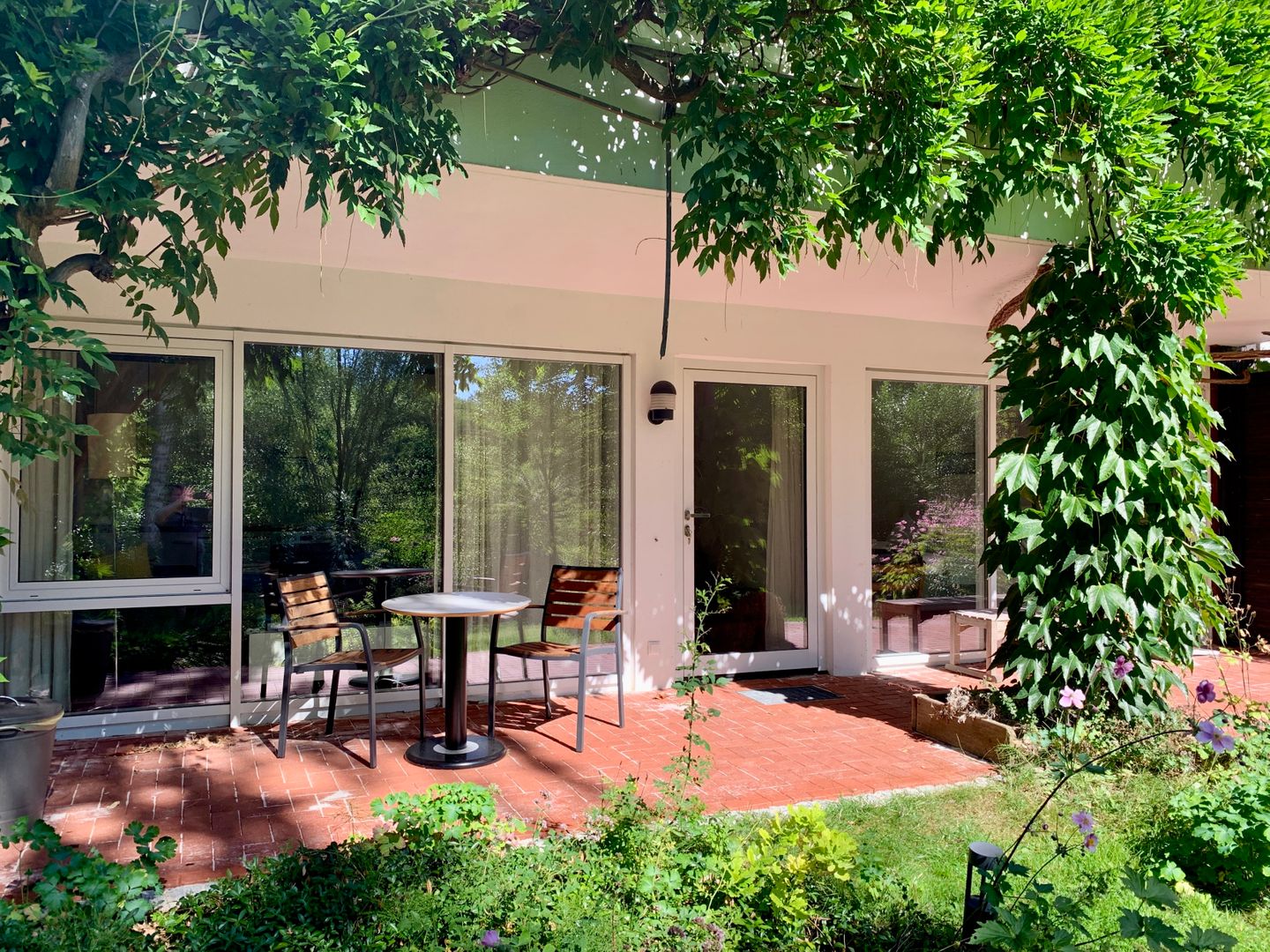 Erholung pur und absolute Ruhe mit direktem Gartenzugang zum Naturgarten. Das frische renovierte Zweizimmerapartment erwartet Sie mit einem neu eingerichteten Schlafzimmer mit neuem Polsterbett und hochwertigen Geltexmatratzen für einen erholsamen Schlaf. Ein Fernseher ist ebenfalls im Schlafzimmer vorhanden und Verdunklungsvorhänge sorgen für einen erholsamen Aufenthalt. Der Smart TV und ein AlexaEcho im Wohn-Essbereich lassen garantiert keine Langeweile aufkommen. Die komplett ausgestattete Küchenzeile, mit Backofen, Ceranfeld, großem Kühlschrank und Gefrierfach lässt keine Wünsche offen. Die kleine Terrasse mit Blick in den Garten gibt Ihnen die Gelegenheit morgens in der Natur zu frühstücken oder den Abend in Ruhe ausklingen zulassen. Gartenmöbel und eine Relaxliege stehen ebenfalls zur Verfügung.