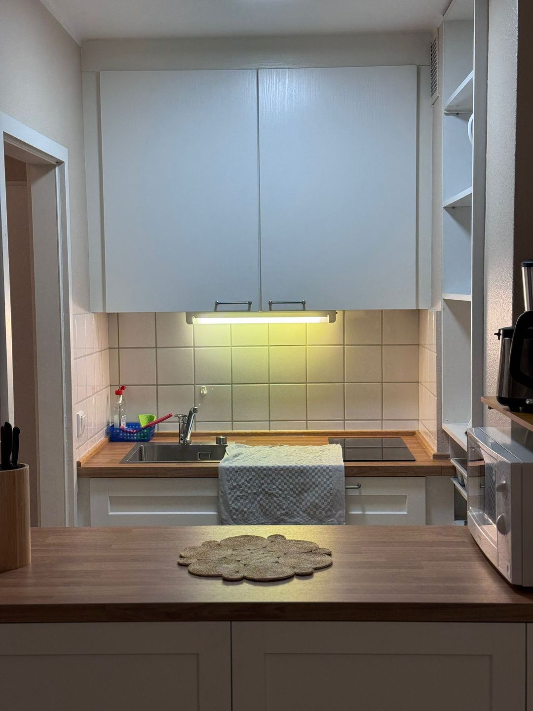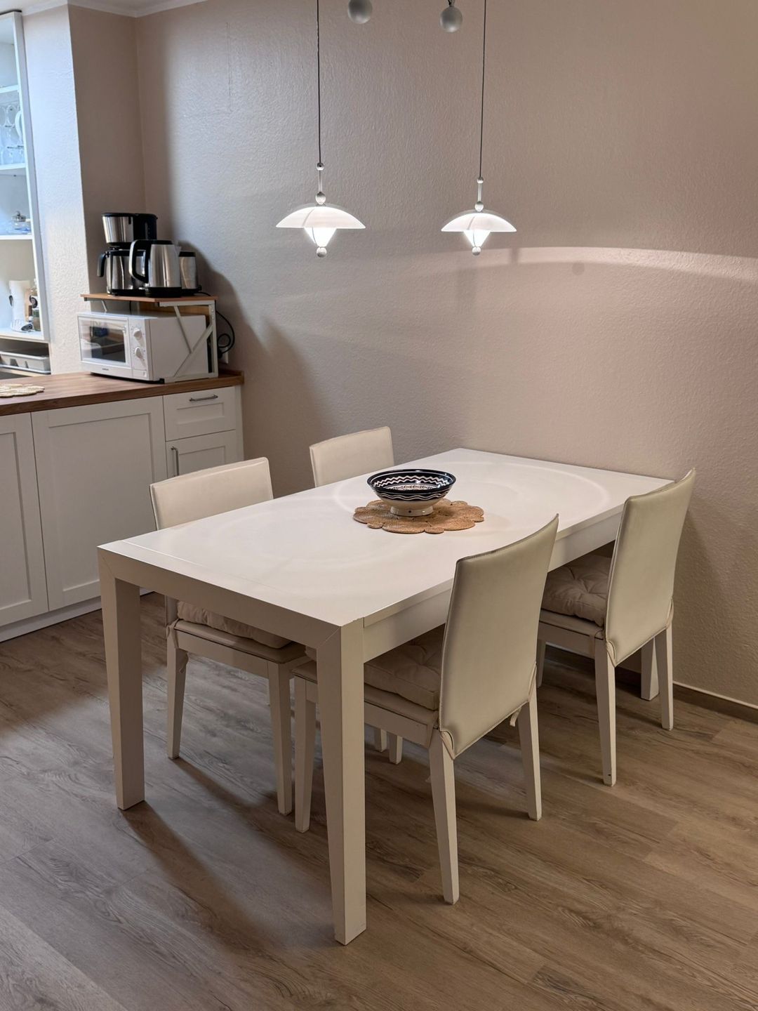 Die offene Einbauküche ist funktional ausgestattet und verfügt unter anderem über eine Mikrowelle. Der angrenzende Esstisch bietet Platz für bis zu 4 Personen, Geschirr ist entsprechend vorhanden.