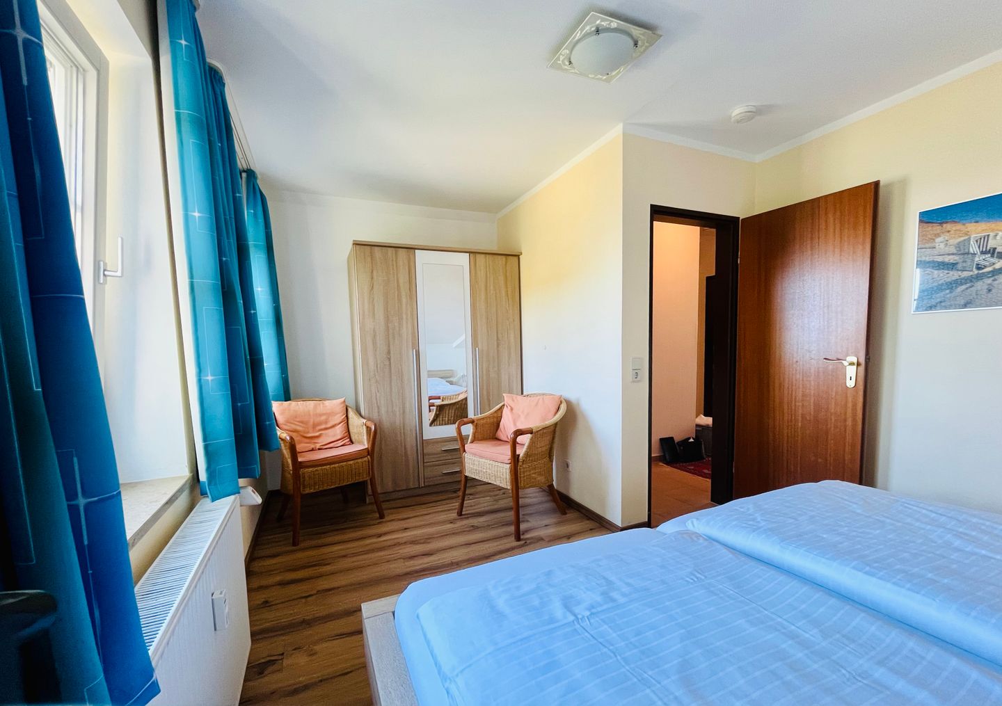 Das Schlafzimmer verfügt über ein komfortables Doppelbett und ausreichend Stauraum für Ihre persönlichen Sachen. Von Fenster des Schlafzimmers aus haben Sie einen direkten Meerblick. Im zweiten Schlafzimmer steht Ihnen eine Schlafcouch zur Verfügung. Ideal für Kinder.