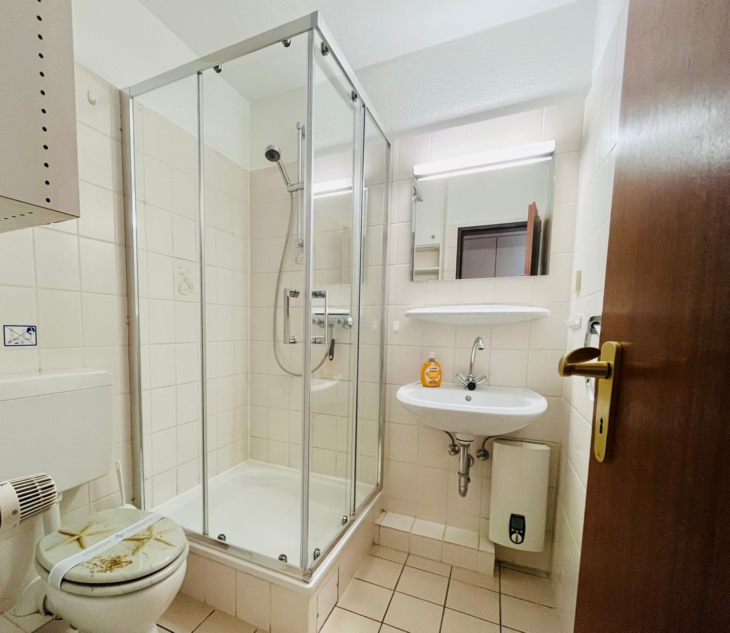 Das Badezimmer ist modern ausgestattet und verfügt über eine Dusche, ein Waschbecken, einen Haarföhn und eine Toilette.