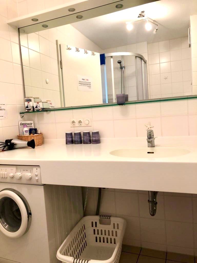 Das Duschbad besitzt einen extra großen Waschtisch mit Spiegel, eine verglaste Runddusche und einen Handtuchwärmekörper. Die Waschmaschine mit integriertem Trockner komplettiert dieses Duschbad, so dass Sie bei Bedarf Ihre Wäsche unkompliziert reinigen können. Selbstverständlich sind in der MeerZeit neben einem Wäschekorb, Handseife und Toilettenpapier für den Start auch ein Föhn und ein Kosmetikspiegel vorhanden.