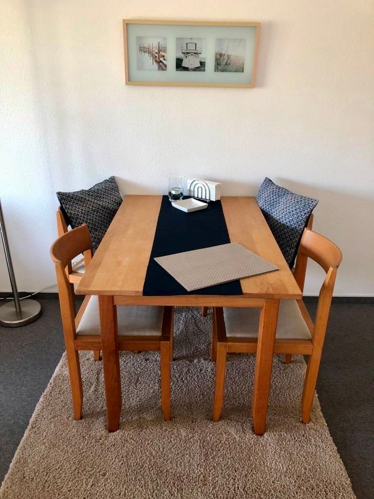 Ein schöner Holztisch mit 4 gemütlichen Stühlen lädt zum Essen ein und bietet Platz für lange Spieleabende.