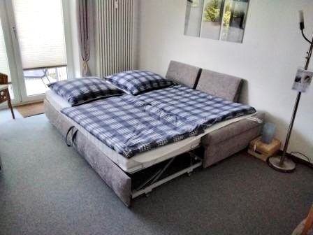 Das Schlafzimmer ist mit einem 1,80 m (2x90x200cm) breiten Doppelbett mit zwei Federkernmatratzen, 2 Nachttischen und einem geräumigen Kleiderschrank ausgestattet. Die Matratzen bieten zwei unterschiedliche Härtegrade für einen individuellen Schlafkomfort. Vom Schlafzimmer aus haben Sie Zugang auf den Balkon in Nord-Ostlage. Hier können Sie mit der Morgensonne gemütlich Ihr Frühstück zu sich nehmen, Ihr Lieblingsbuch lesen oder einfach nur die Seele baumeln lassen. Moderne Vorhänge und elektrische Außenrolladen bieten ihnen Sichtschutz bzw. verdunkeln das Schlafzimmer nach Belieben. Im Sommer bieten die Außenrolladen außerdem einen hervorragenden Schutz gegen die Wärme.