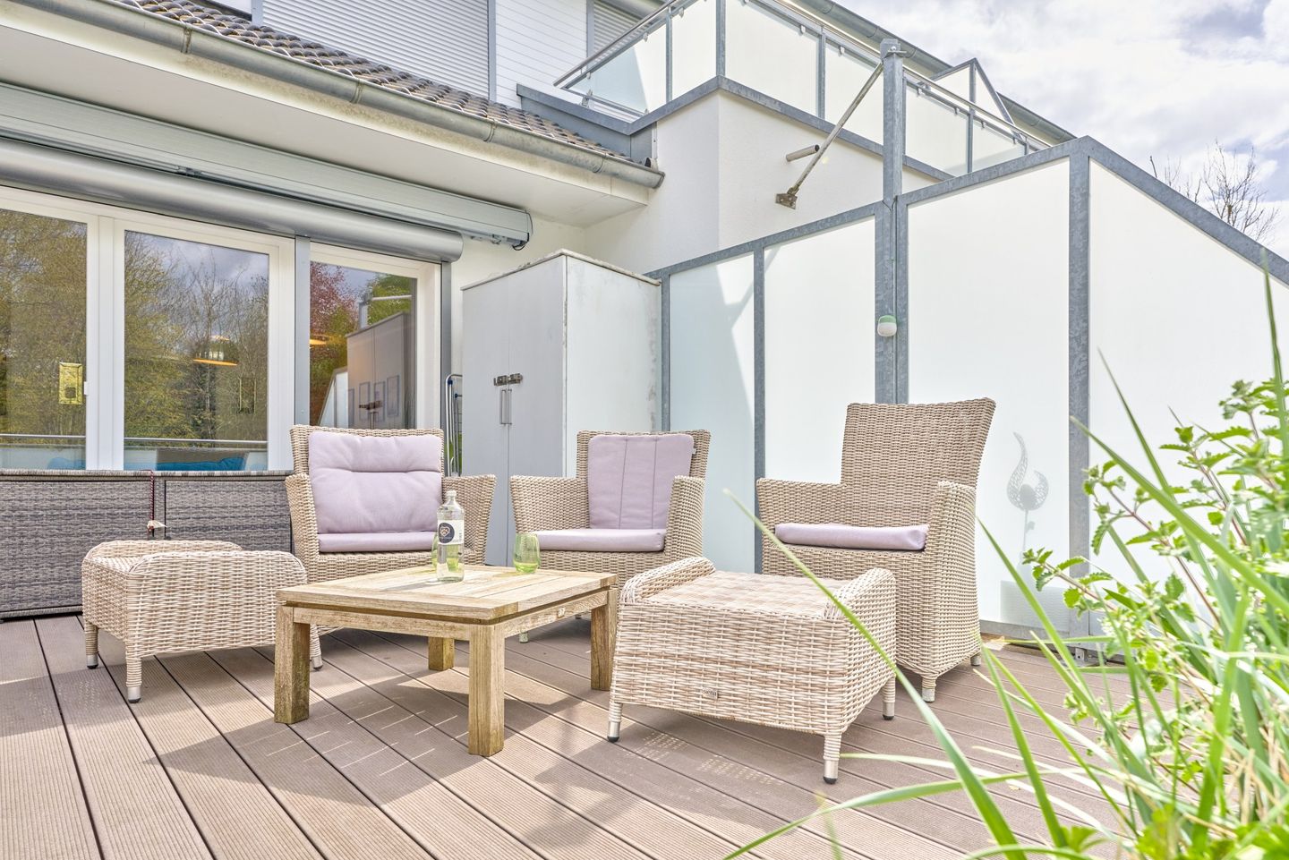 Ein Strandkorb lädt dazu ein, sich zurückzulehnen und die frische Meeresluft zu genießen, während Sie gleichzeitig vor Sonne und Wind geschützt sind. Erleben Sie die typische Ostsee-Entspannung in Ihrem eigenen kleinen Rückzugsort direkt auf der Terrasse.Zusätzlich dazu finden Sie bequeme Gartenmöbel auf der Terrasse, die ideal sind, um gemütlich zusammenzusitzen, zu plaudern und die Sonne zu genießen. Ob Sie sich beim Frühstück im Freien verwöhnen lassen oder den Tag bei einem Glas Wein ausklingen lassen möchten, diese Gartenmöbel bieten den perfekten Ort dafür.