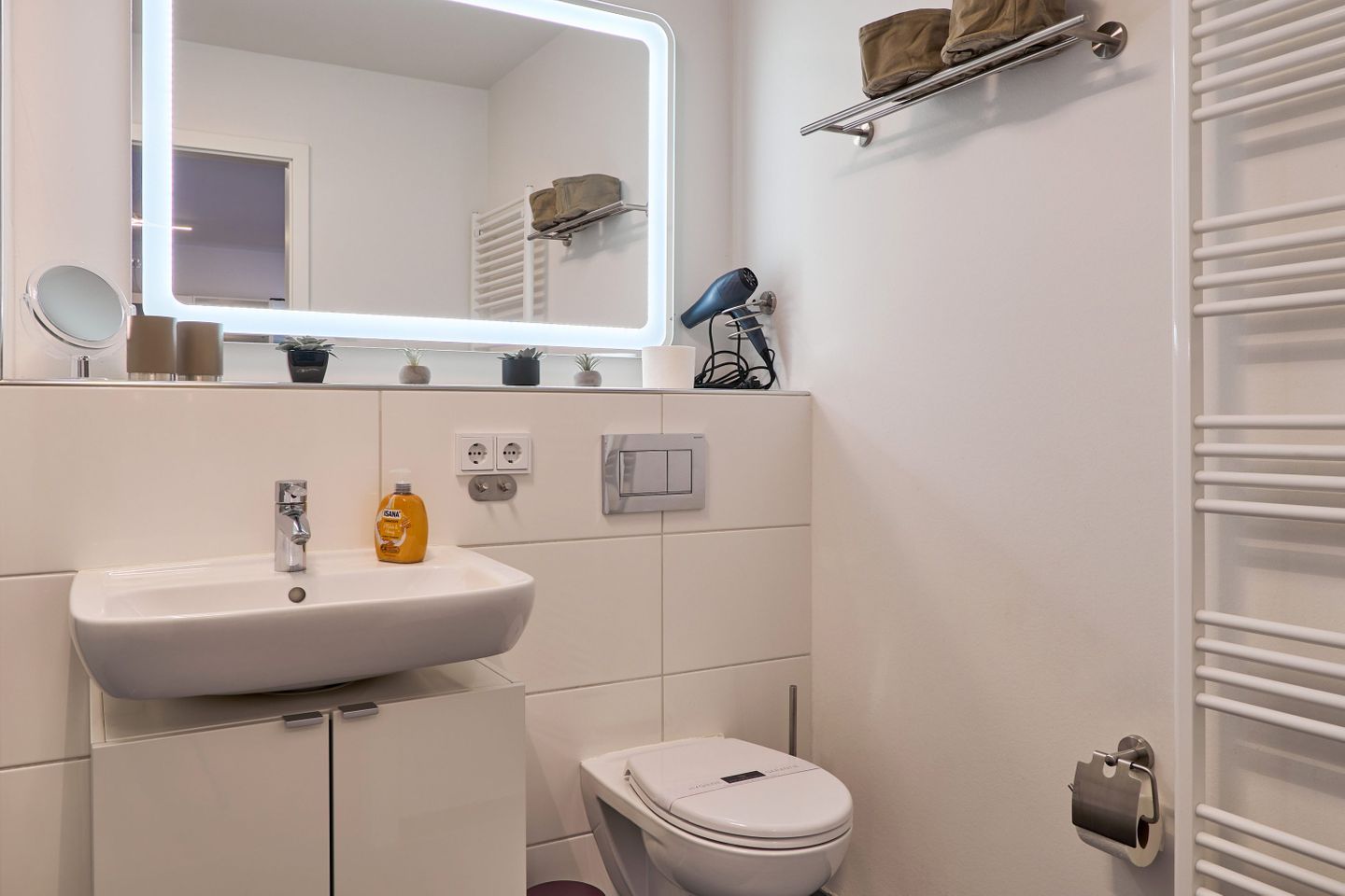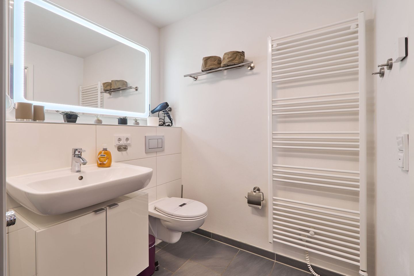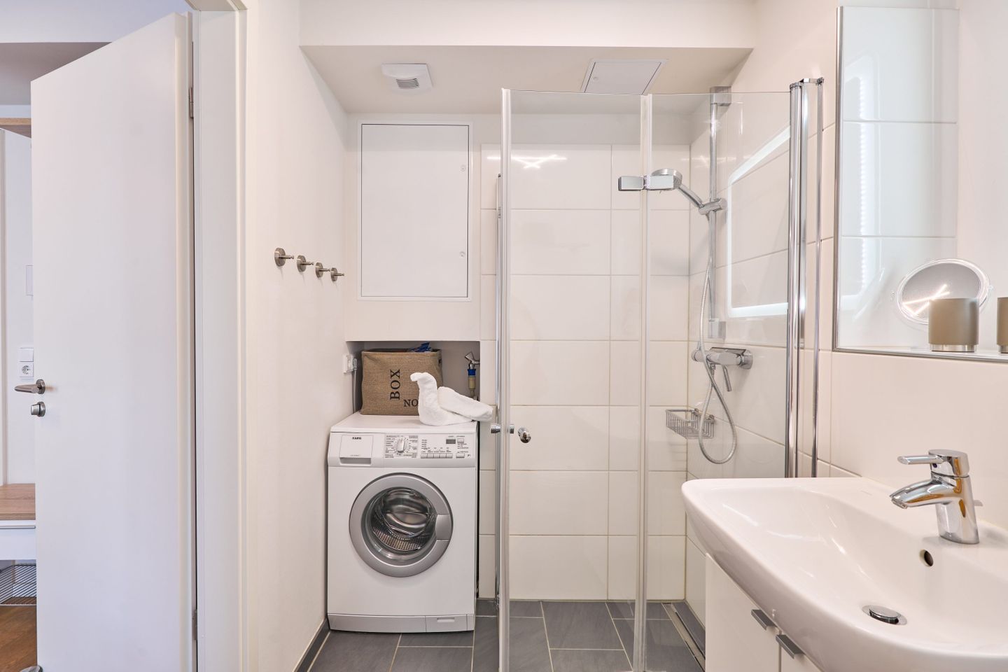 Das stilvolle Badezimmer ist modern gestaltet und mit einer großzügigen, bodentiefen Dusche ausgestattet, die Ihnen höchsten Komfort bietet. Eine Waschmaschine steht Ihnen ebenfalls zur Verfügung, was besonders für längere Aufenthalte praktisch ist.