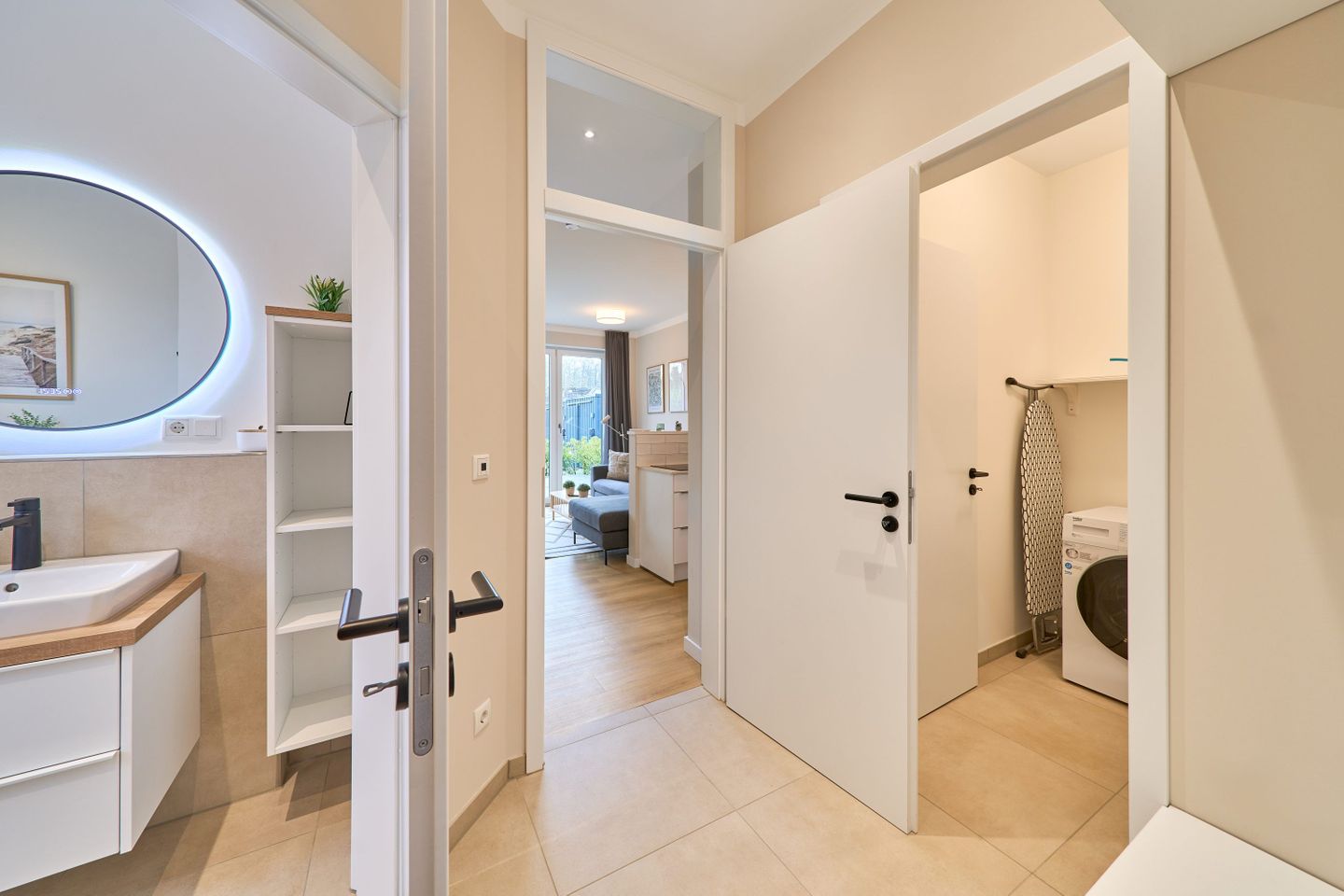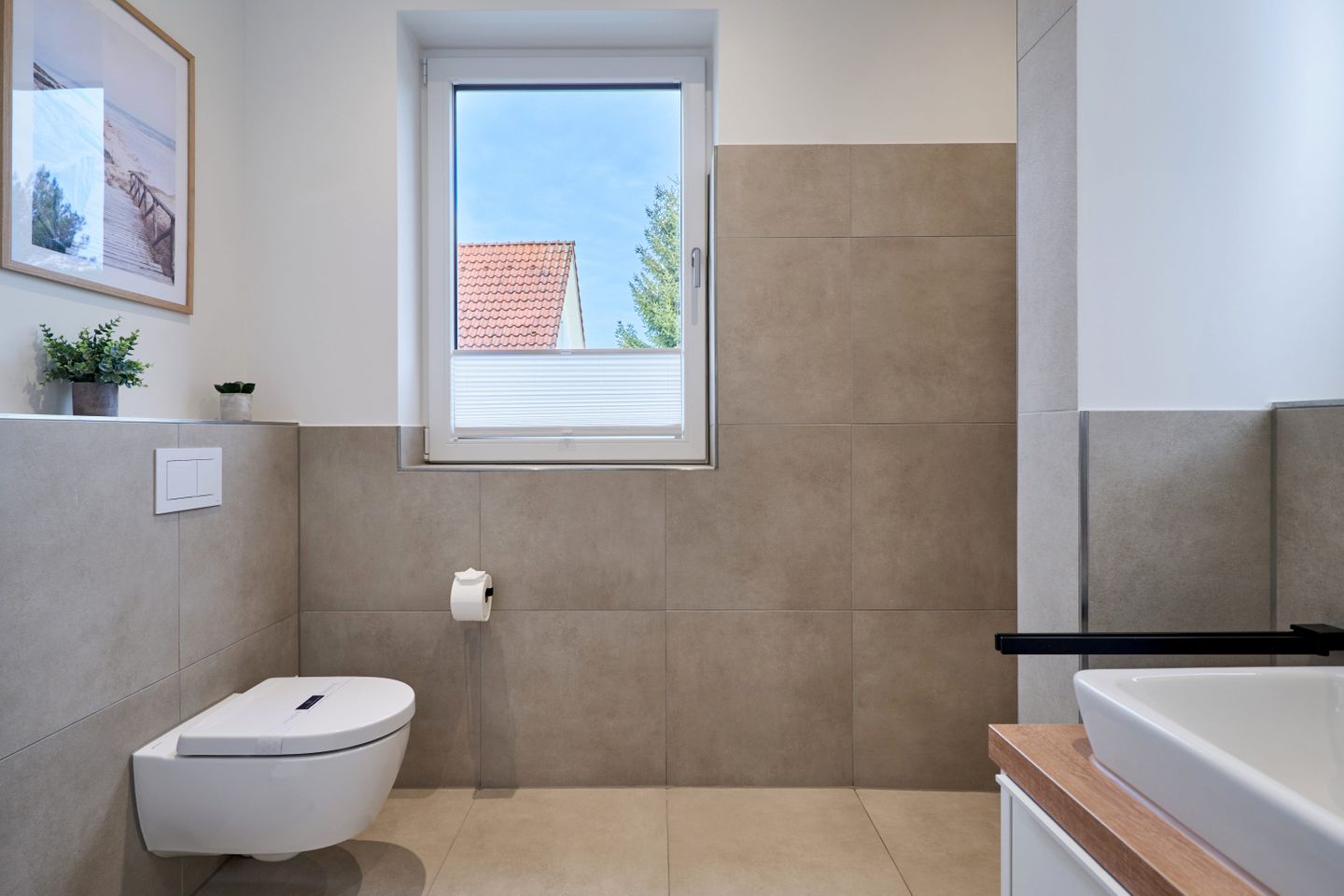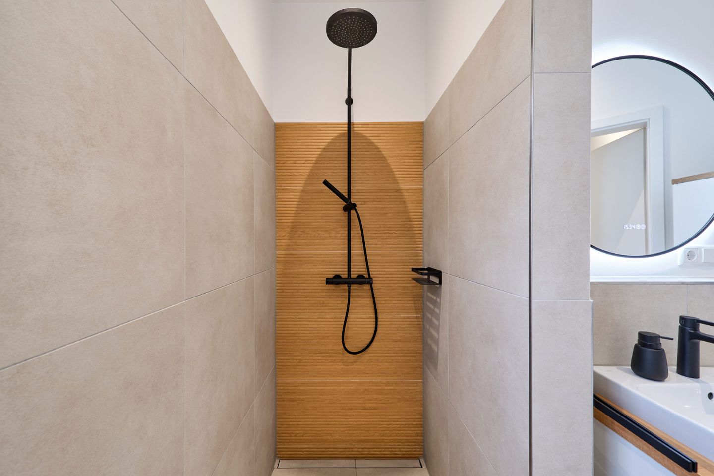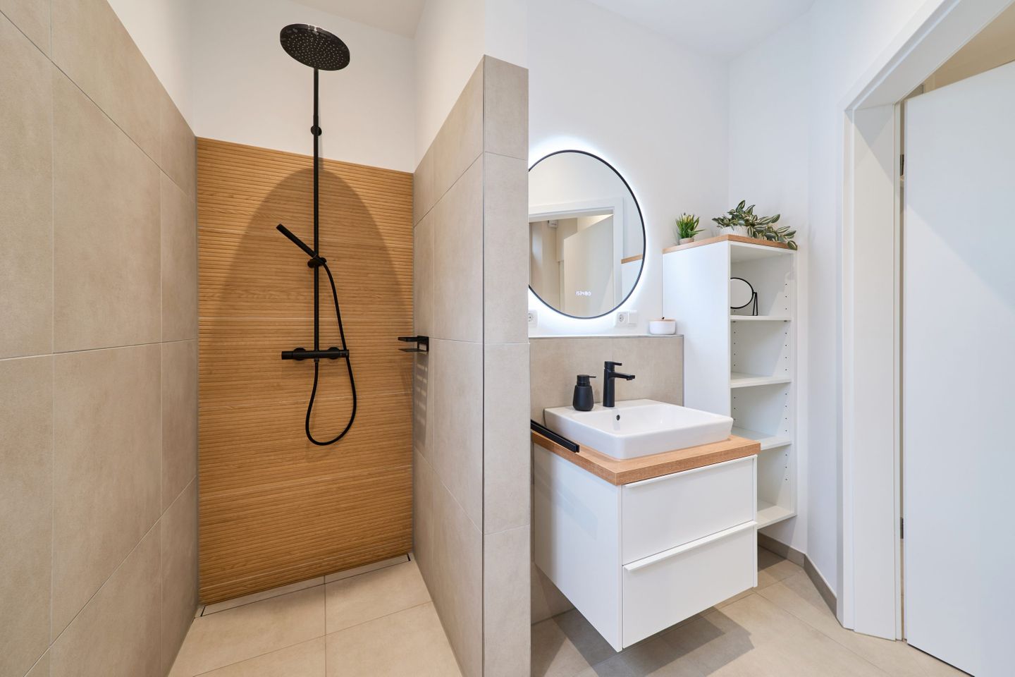 Das Badezimmer ist modern in neutralen Naturtönen gestaltet und besticht mit einem beleuchteten Spiegel samt Spiegelheizung – ein echtes Highlight für das tägliche Frischegefühl. Ein Föhn ist ebenfalls vorhanden.