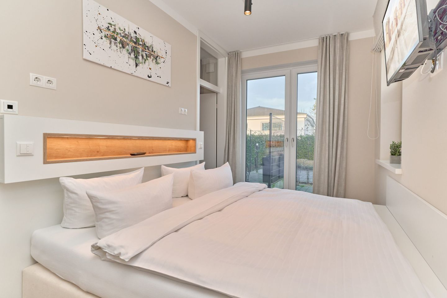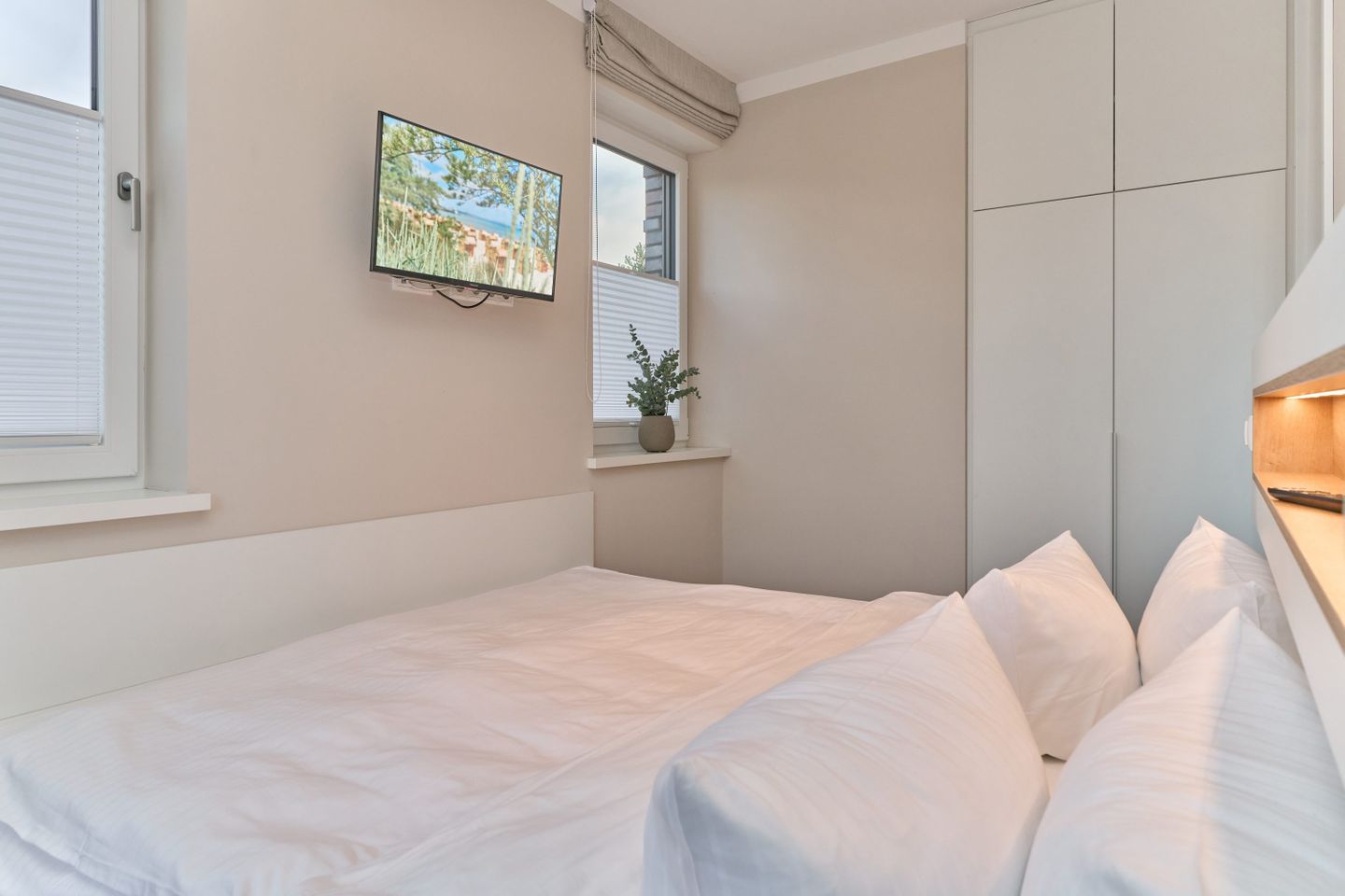 Das gemütliche Schlafzimmer ist mit einem großzügigen Boxspringbett (180x200 cm), einem Smart-TV (32 Zoll) und einem geräumigen Kleiderschrank ausgestattet, in dem Ihr während Eures Aufenthalts bequem alles verstauen könnt.
