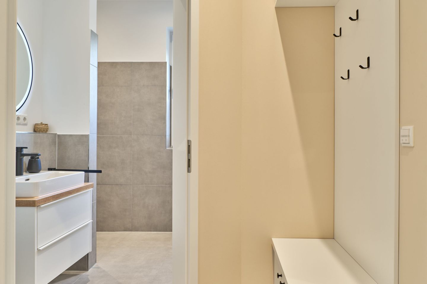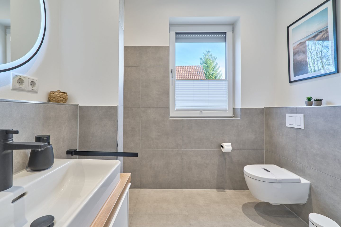 Das Badezimmer ist modern in neutralen Naturtönen gestaltet und besticht mit einem beleuchteten Spiegel samt Spiegelheizung – ein echtes Highlight für das tägliche Frischegefühl. Ein Föhn ist ebenfalls vorhanden.