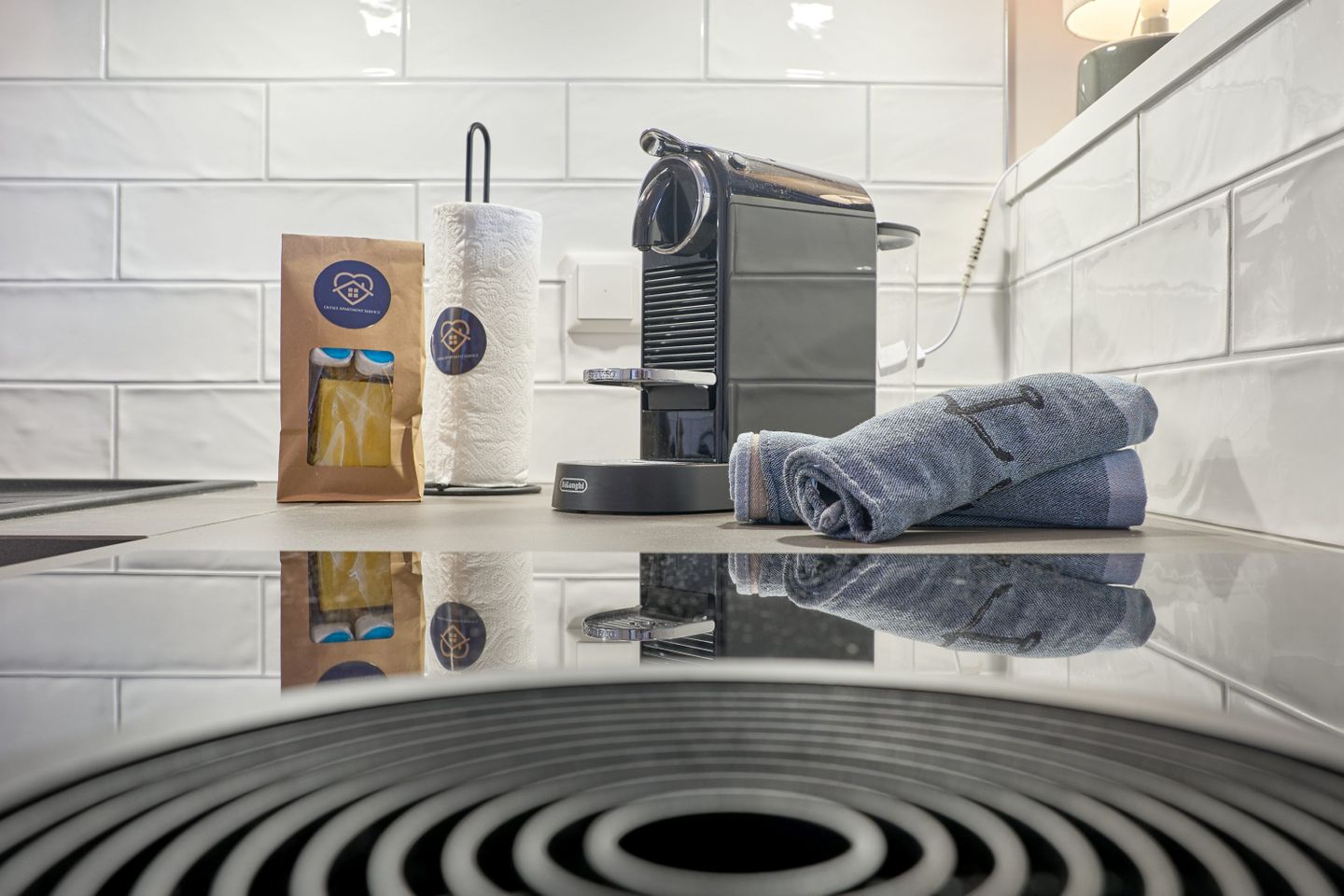 Der Essbereich und die voll ausgestattete Küche lassen keine Wünsche offen. Neben einer Nespresso-Maschine, einer Filterkaffeemaschine und einem Wasserkocher stehen auch Toaster, Mikrowelle, Backofen, Geschirr sowie Töpfe und Pfannen zur Verfügung.