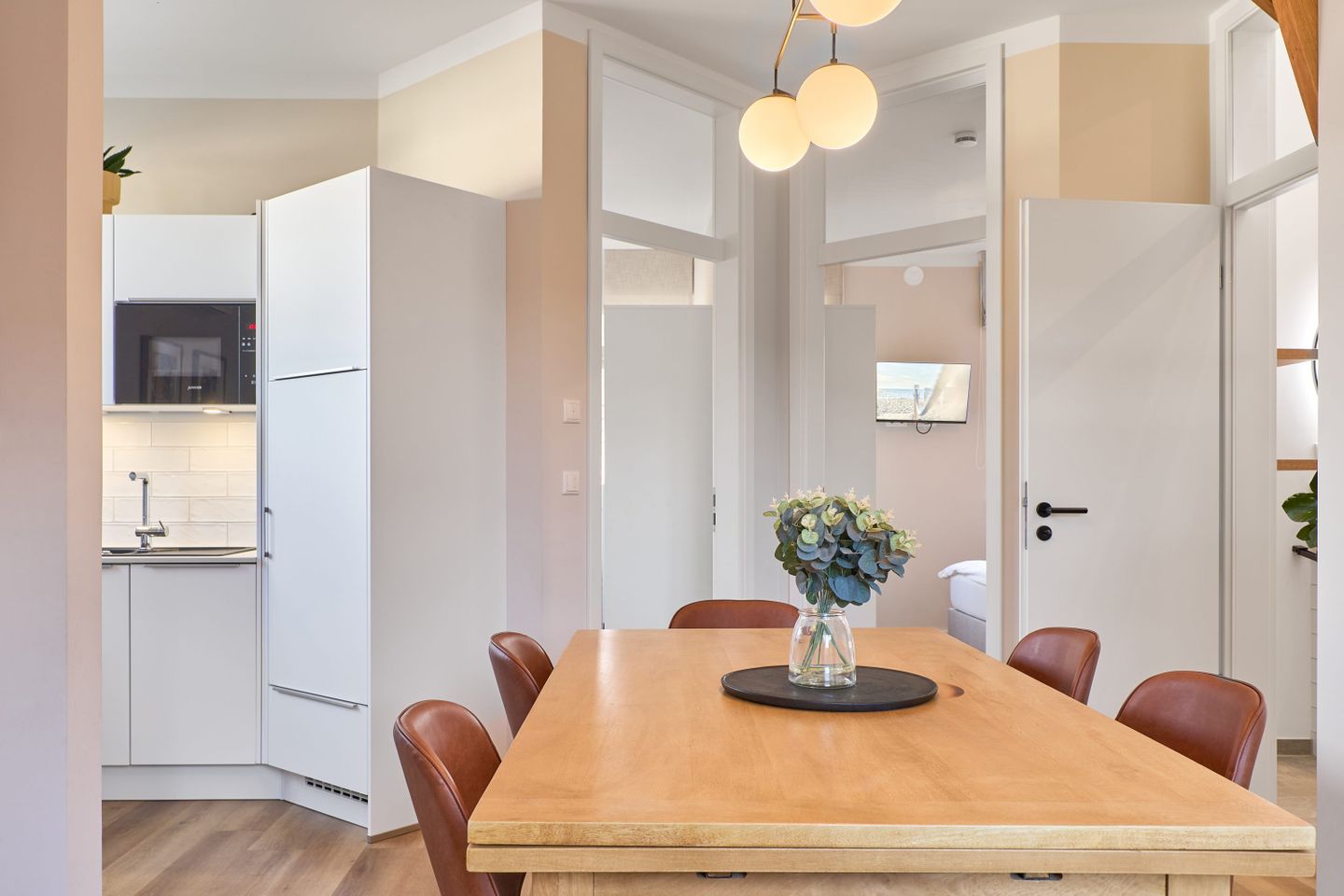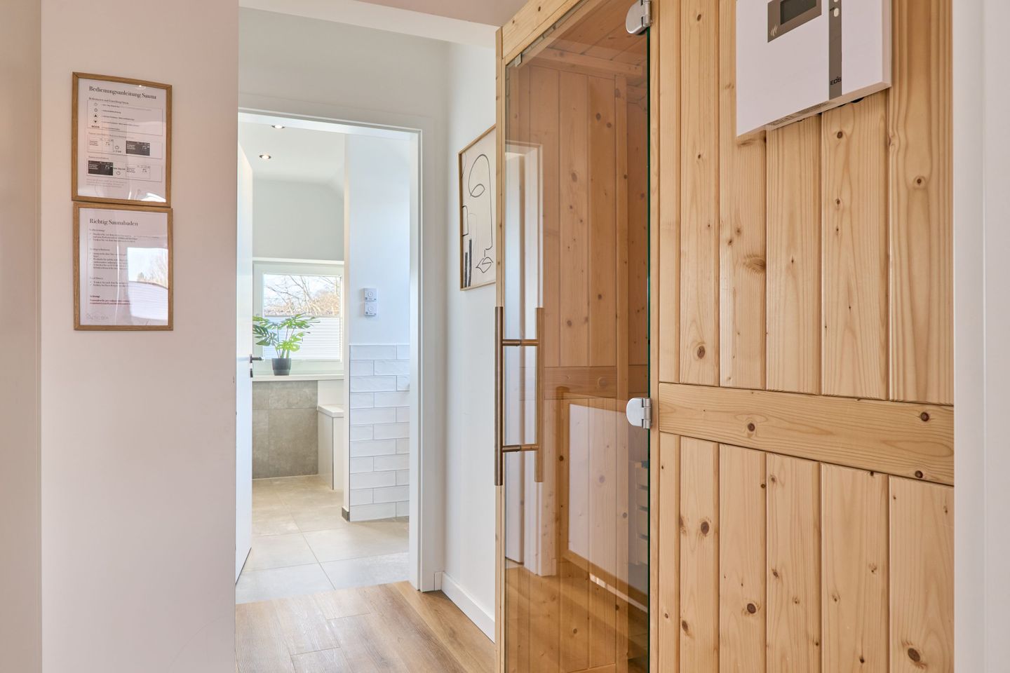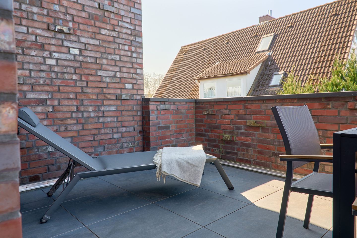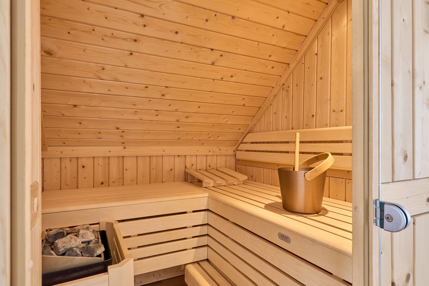 Die beiden Apartments im Obergeschoss verteilen sich über zwei Etagen und bieten ein exklusives Wohngefühl. Ausgestattet mit einer privaten Sauna und einer großzügigen Dachterrasse, bieten sie einen besonderen Rückzugsort für Wellness und Entspannung. Die Dachterrassen laden zu einem Panoramablick ein und sind perfekt für ruhige Abende bei Sonnenuntergang. Die durchdachte Raumaufteilung über zwei Ebenen schafft ein großzügiges Raumgefühl und bietet ideale Bedingungen für Familien oder kleine Gruppen.