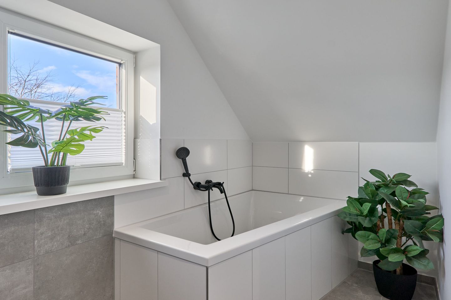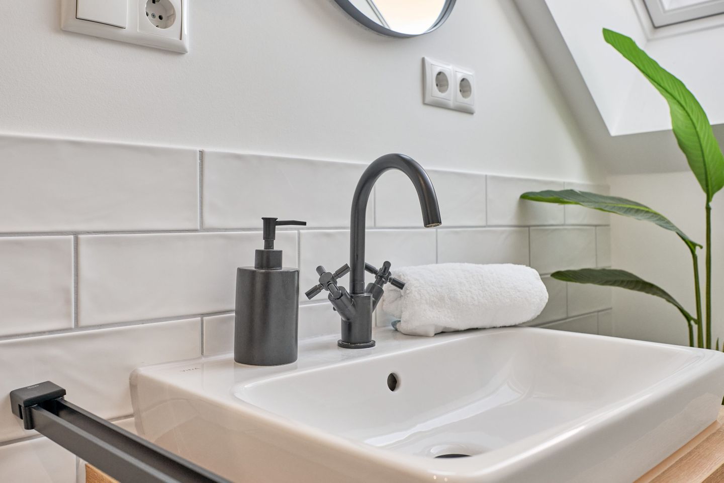 Zwei stilvolle Badezimmer in neutralen Naturtönen machen die Wohnung zu einer kleinen Wohlfühloase: Das größere Bad bietet eine Badewanne und eine separate Dusche, das zweite Bad ist mit einer geräumigen Dusche ausgestattet. In beiden Badezimmern stehen Pflanzen, die für eine beruhigende Atmosphäre sorgen.