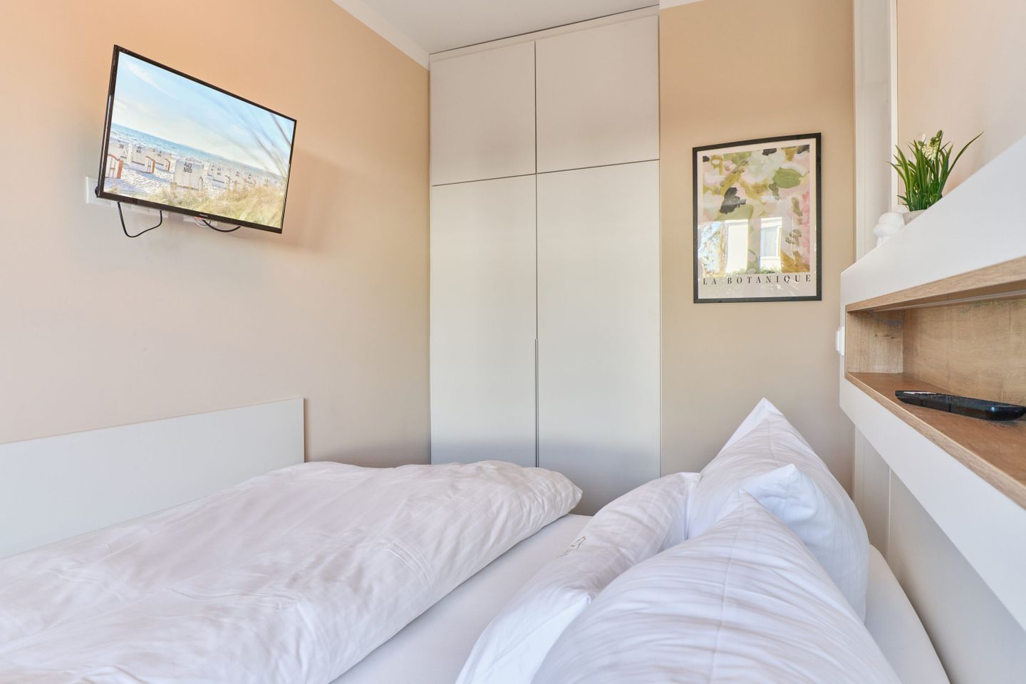 Das gemütliche Schlafzimmer ist mit einem großzügigen Boxspringbett (180x200 cm), einem Smart-TV (32 Zoll) und einem geräumigen Kleiderschrank ausgestattet, in dem Ihr während Eures Aufenthalts bequem alles verstauen könnt.