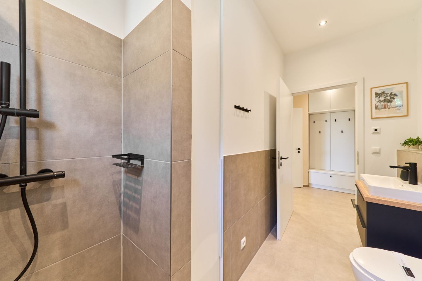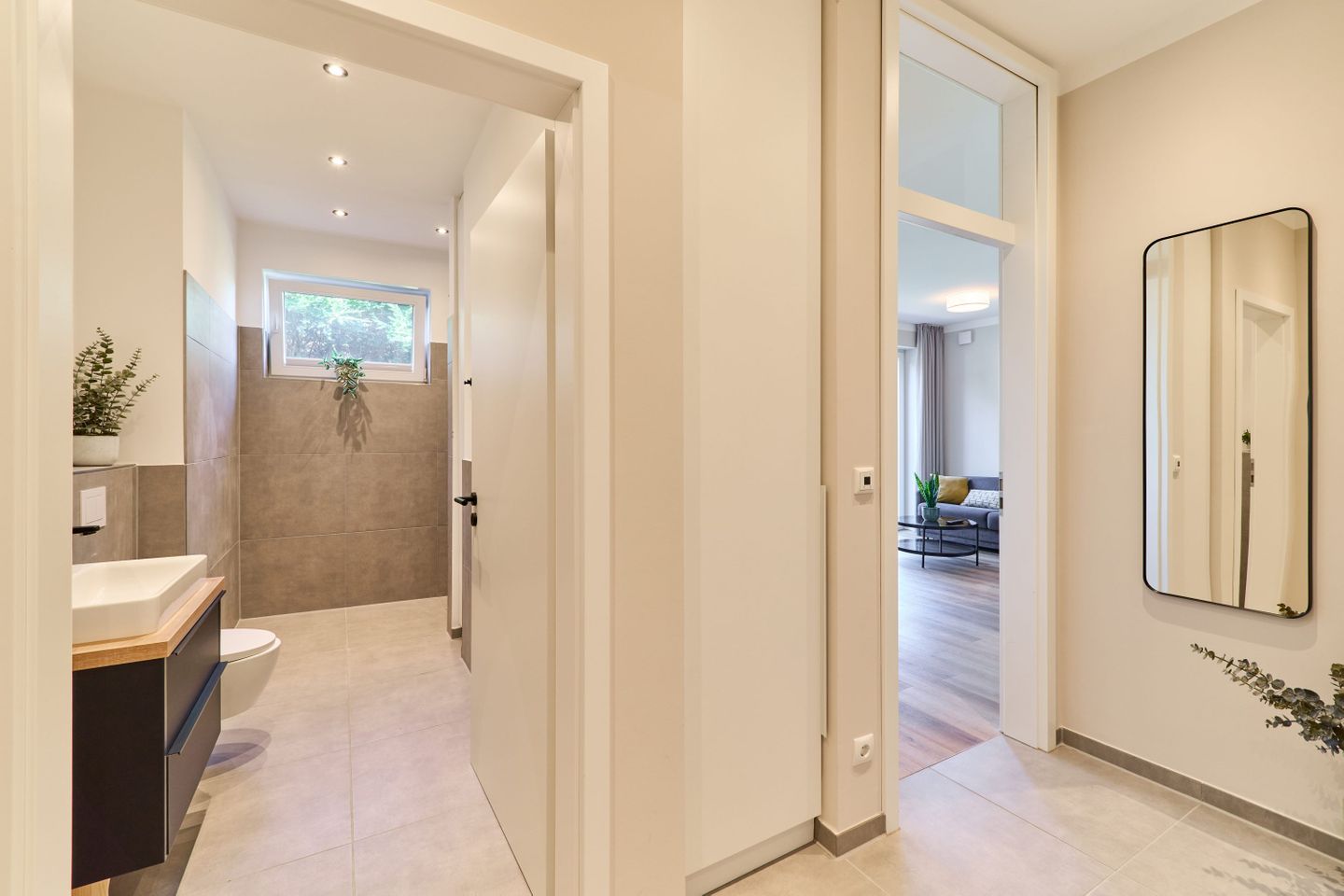 Das Badezimmer ist modern in neutralen Naturtönen gestaltet und besticht mit einem beleuchteten Spiegel samt Spiegelheizung – ein echtes Highlight für das tägliche Frischegefühl. Ein Föhn ist ebenfalls vorhanden.