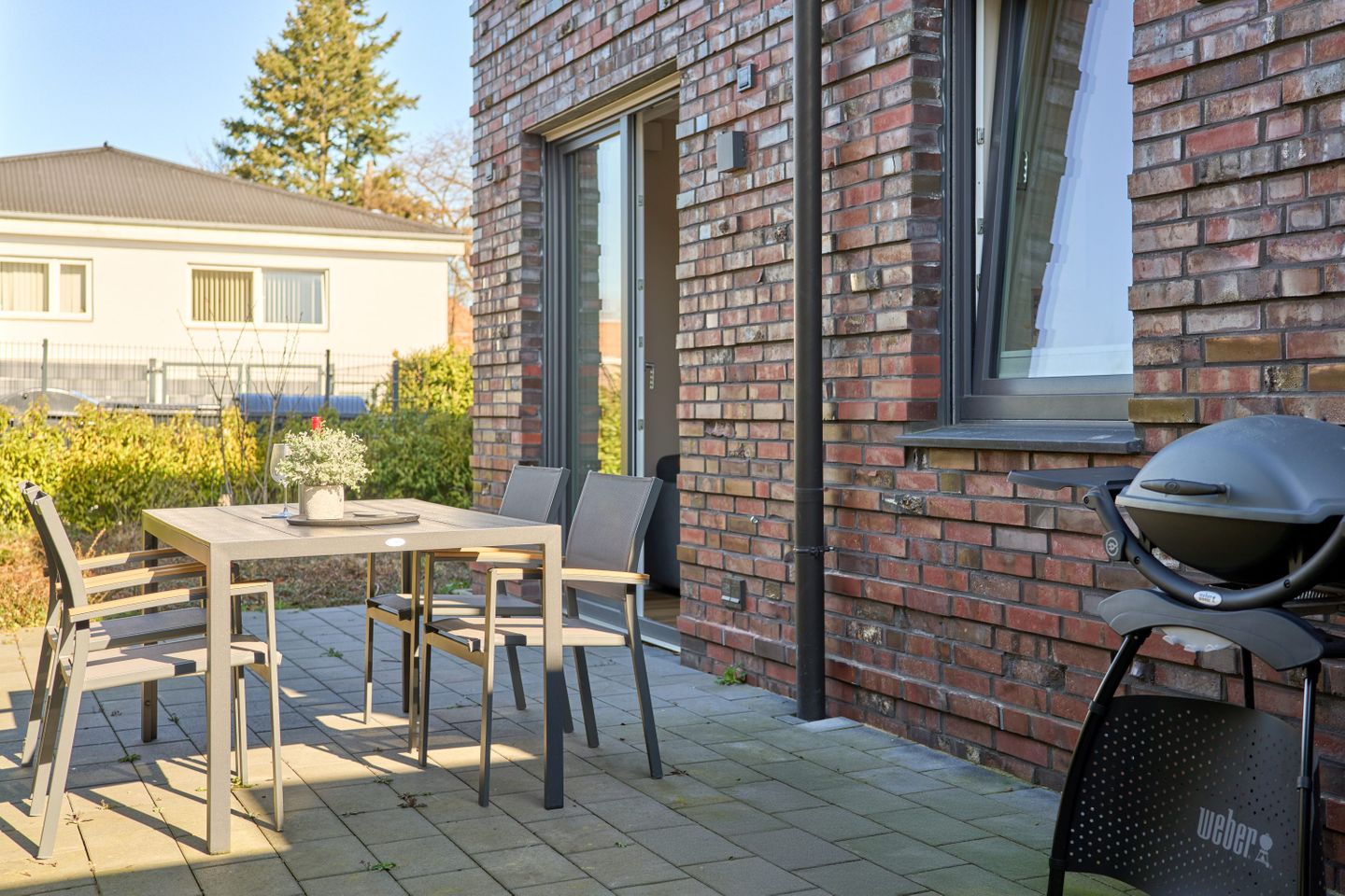 Die sonnige Terrasse und der kleine Gartenbereich laden zum Verweilen ein. Macht es Euch in den Gartenmöbeln bequem und genießt ein kaltes Getränk. Ein Weber-Elektrogrill sowie komfortable Sitzgelegenheiten machen den Außenbereich ideal für entspannte Grillabende.