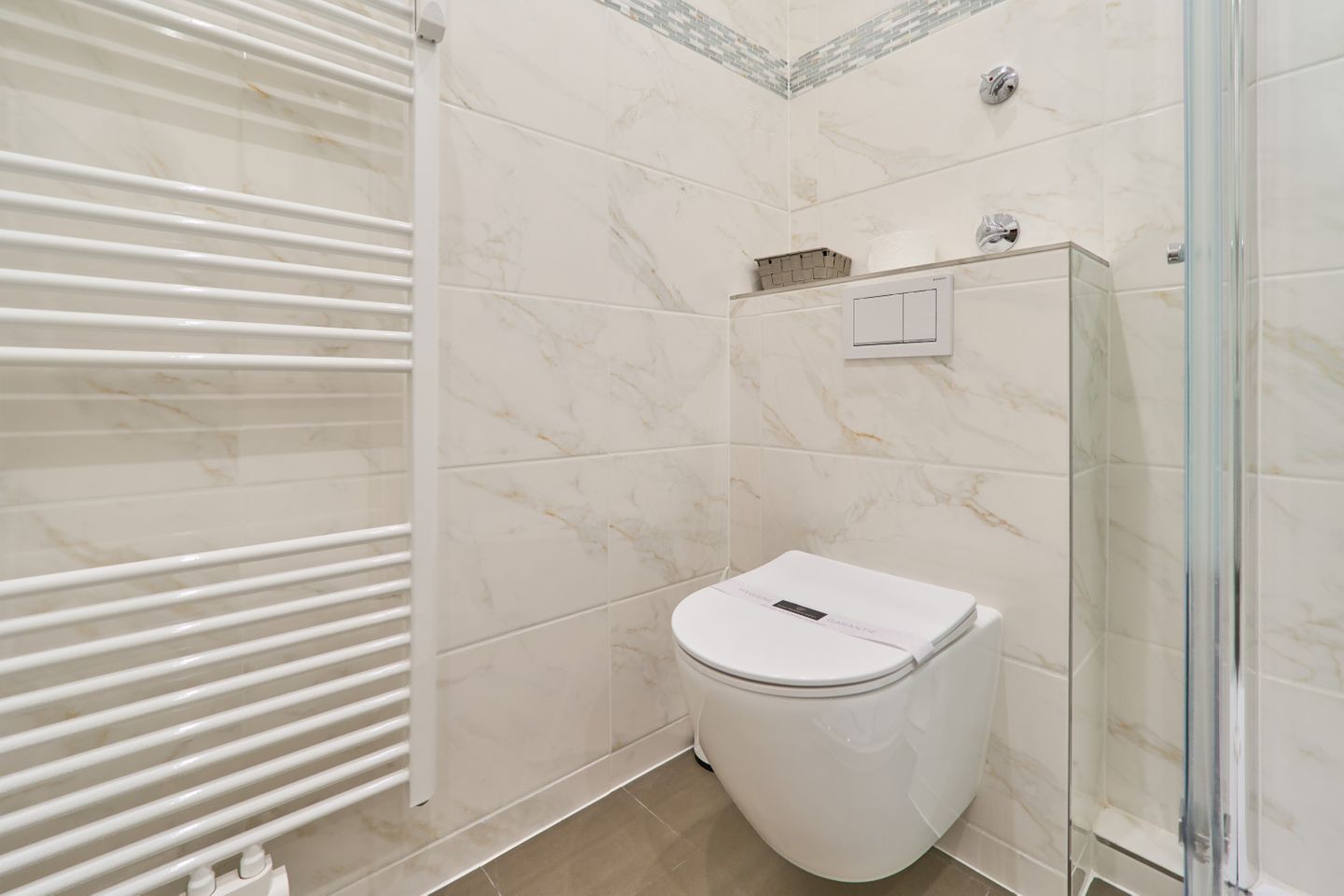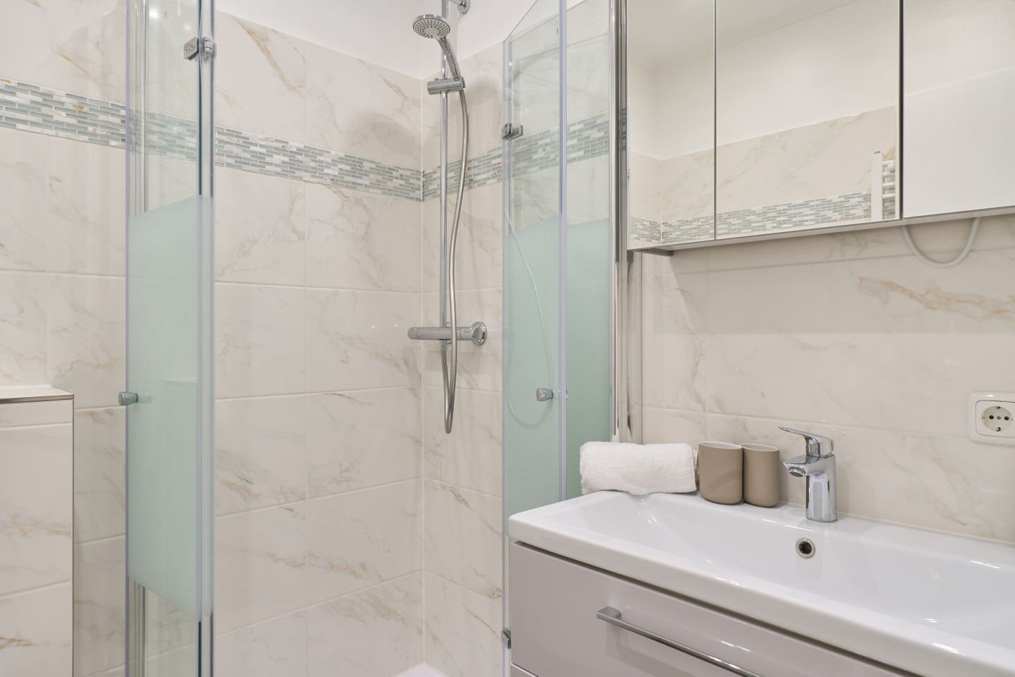 Das moderne Badezimmer bietet eine hochwertige Ausstattung mit Dusche, Waschbecken und WC. Helle Fliesen und stilvolle Akzente verleihen dem Raum eine angenehme Frische, die zu einem gelungenen Start in den Tag beiträgt.