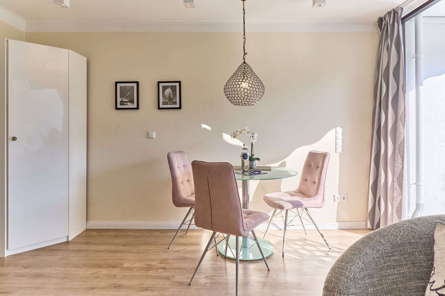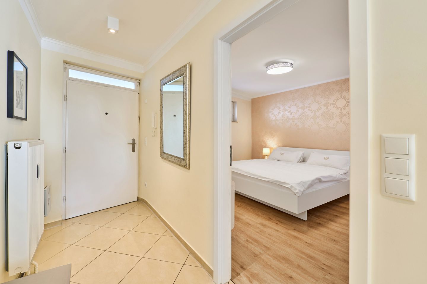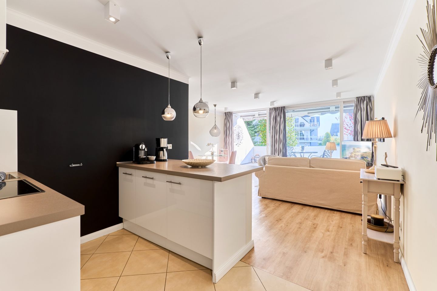 Beim Betreten des Apartments erwartet Sie eine elegante und gemütliche Atmosphäre. Ein Highlight der Wohnung ist der helle, offene Wohn-Essbereich, der einladend gestaltet und stilvoll möbliert ist. Hier können Sie gemeinsame Mahlzeiten genießen, entspannen oder einen gemütlichen Abend bei einem Film verbringen.