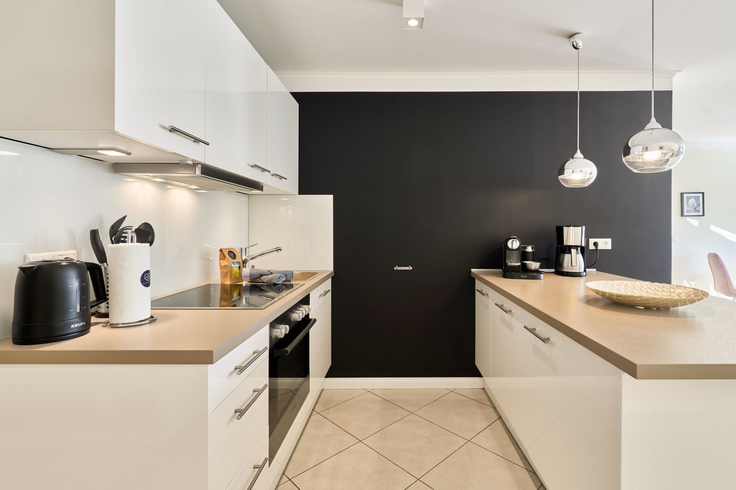In der modernen, voll ausgestatteten Küche können Sie Ihre Lieblingsgerichte zubereiten. Sie verfügt über hochwertige Geräte wie eine Spülmaschine, Kaffeemaschine, Mikrowelle, einen Herd mit Cerankochfeld und eine Nespresso-Maschine für den perfekten Start in den Tag. Auch an Küchenutensilien, Geschirr und Besteck ist alles vorhanden, sodass Sie sich wie zuhause fühlen können.
