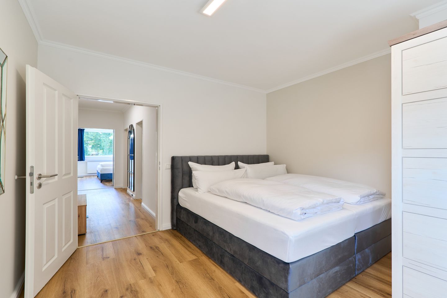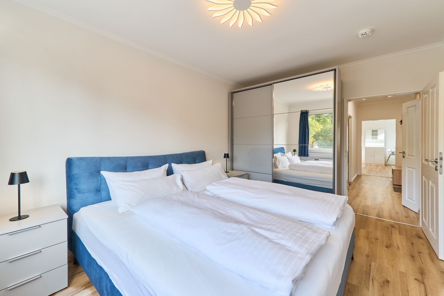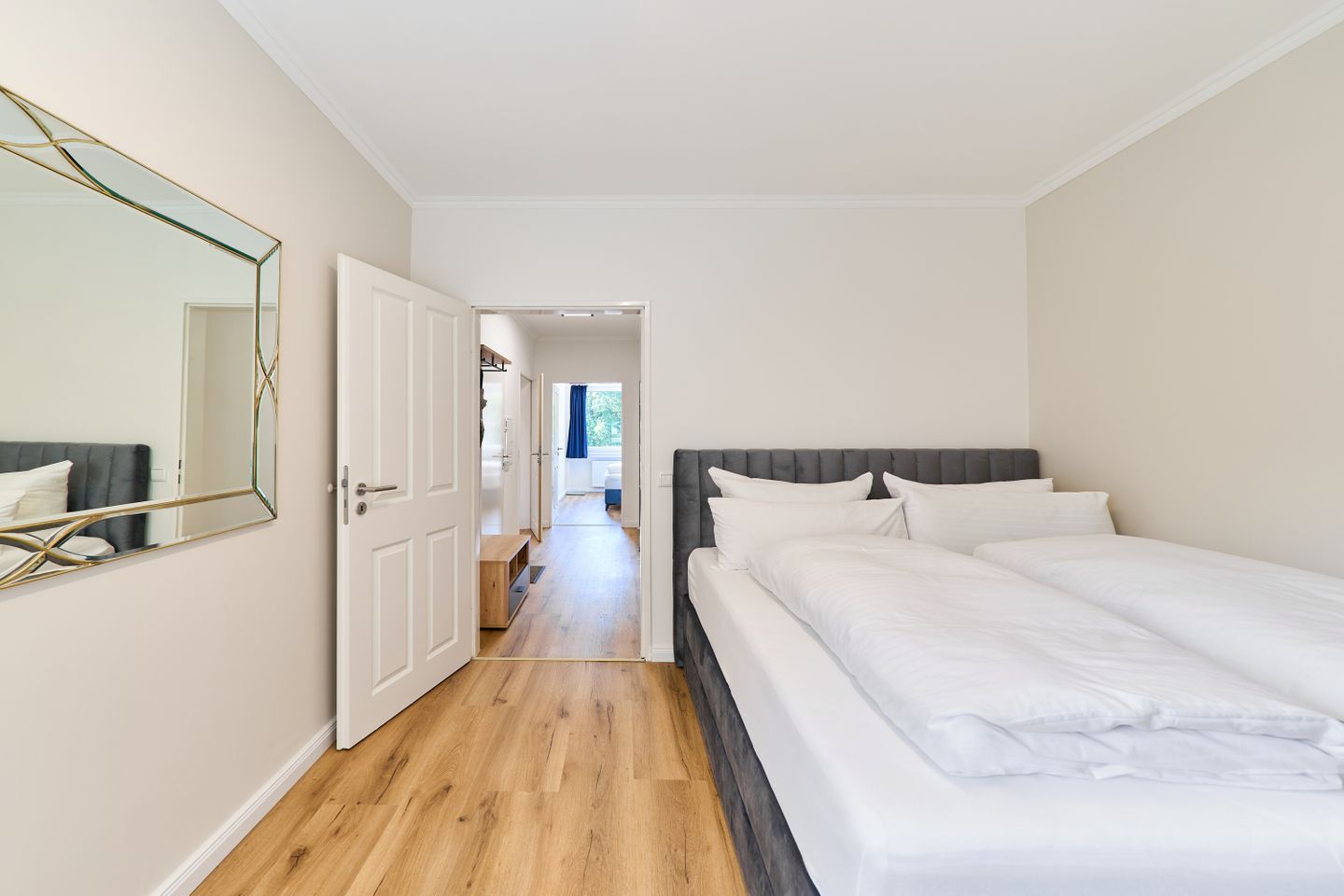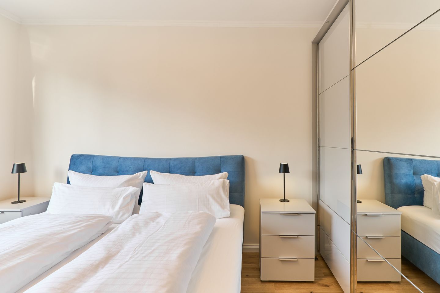 Die Wohnung bietet zwei einladende Schlafzimmer, beide mit hochwertigen Doppelbetten ausgestattet, die für einen erholsamen Schlaf sorgen. Das moderne Duschbad überzeugt mit stilvollem Design und erstklassiger Ausstattung, damit Sie sich nach einem langen Tag am Strand oder in der Stadt erfrischen können.