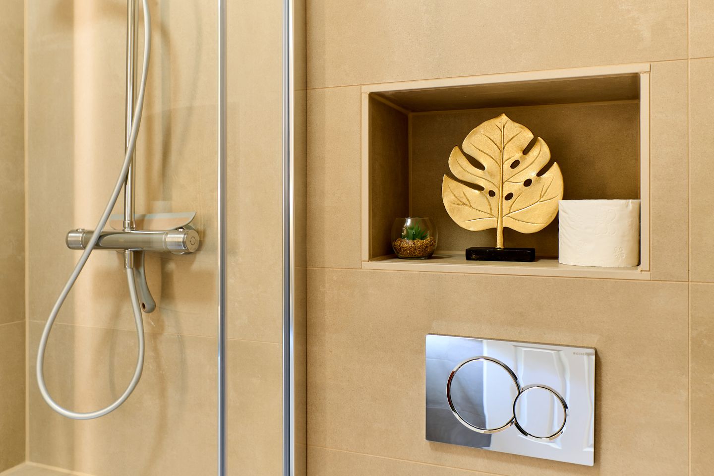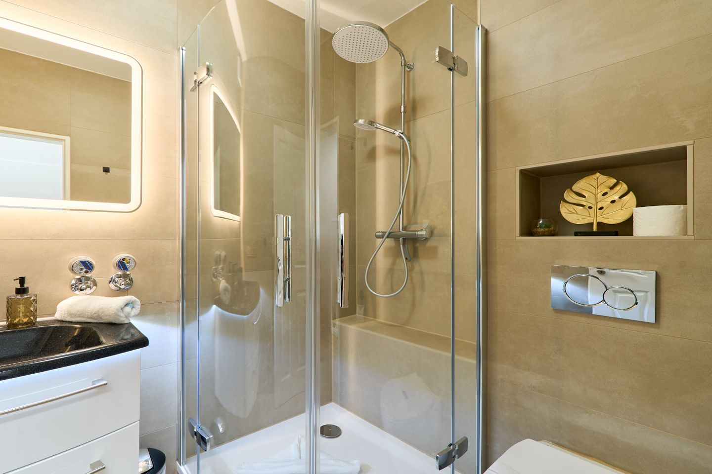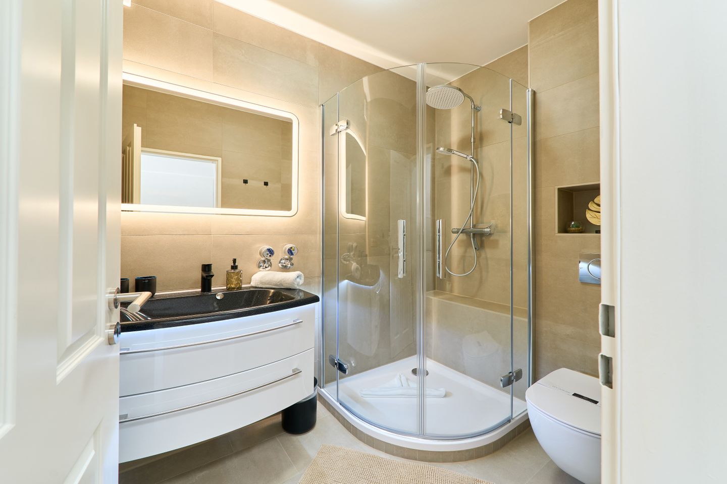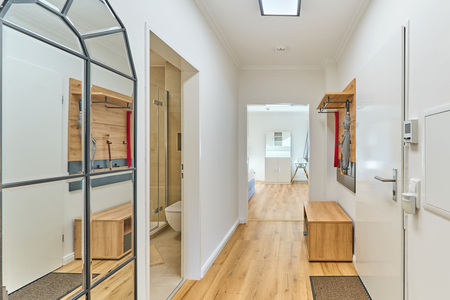 Die Wohnung bietet zwei einladende Schlafzimmer, beide mit hochwertigen Doppelbetten ausgestattet, die für einen erholsamen Schlaf sorgen. Das moderne Duschbad überzeugt mit stilvollem Design und erstklassiger Ausstattung, damit Sie sich nach einem langen Tag am Strand oder in der Stadt erfrischen können.