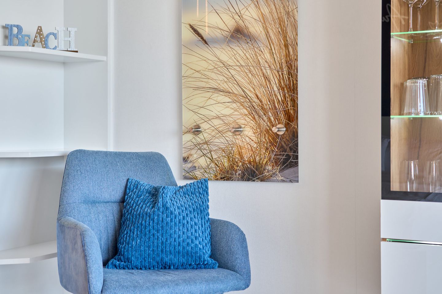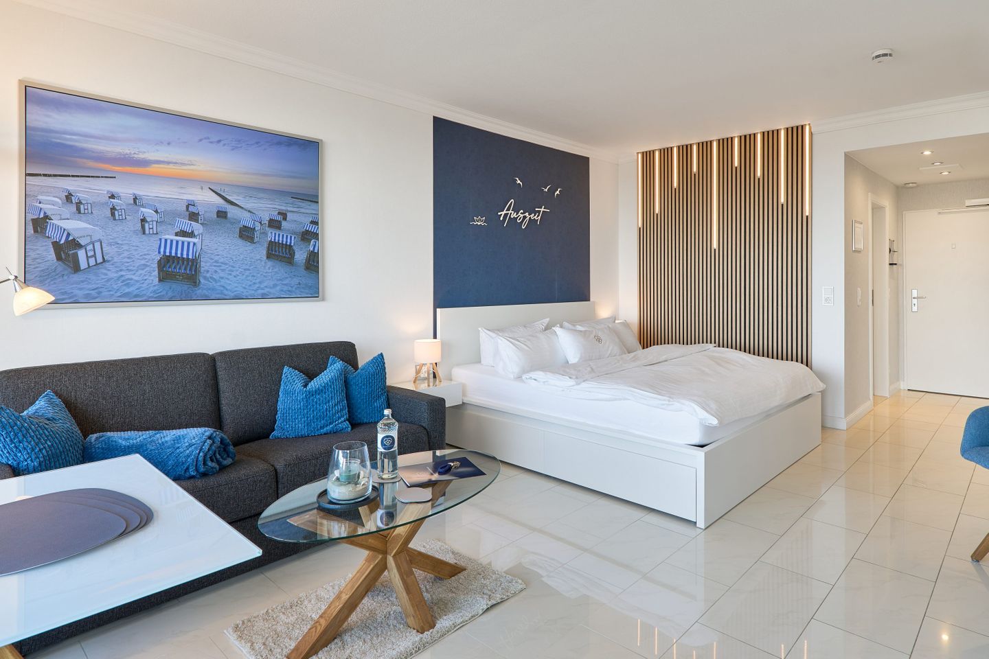 Das Herzstück dieser Wohnung ist zweifellos das geräumige Wohn- und Schlafzimmer, das geschmackvoll eingerichtet ist und eine warme und einladende Atmosphäre schafft. Große Fensterflächen durchfluten den Raum mit natürlichem Licht und bieten gleichzeitig einen spektakulären Blick auf die Umgebung, darunter den weitläufigen Strand und das glitzernde Meer.