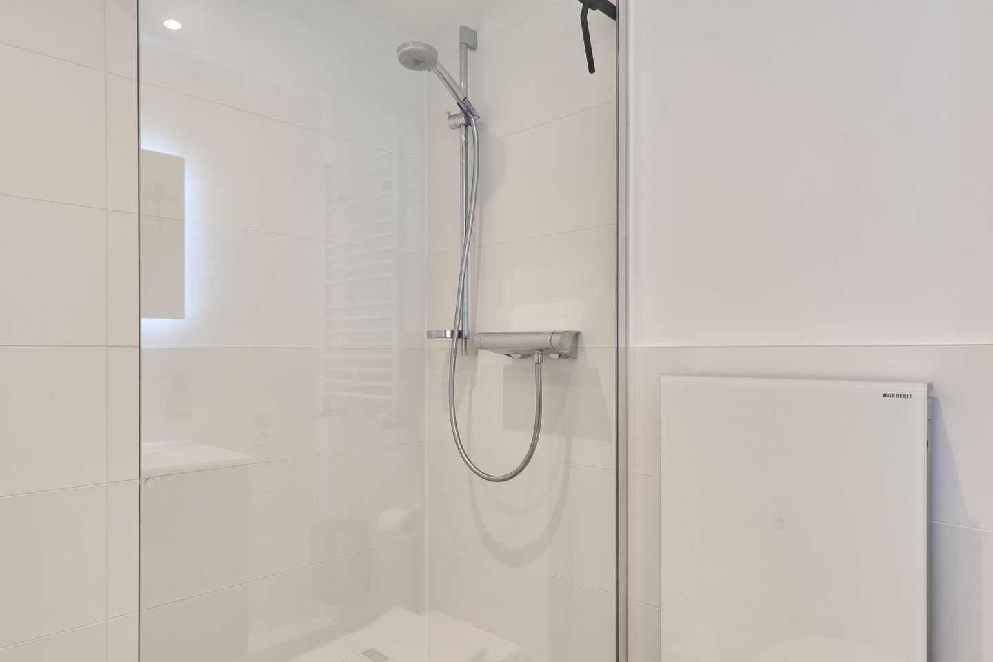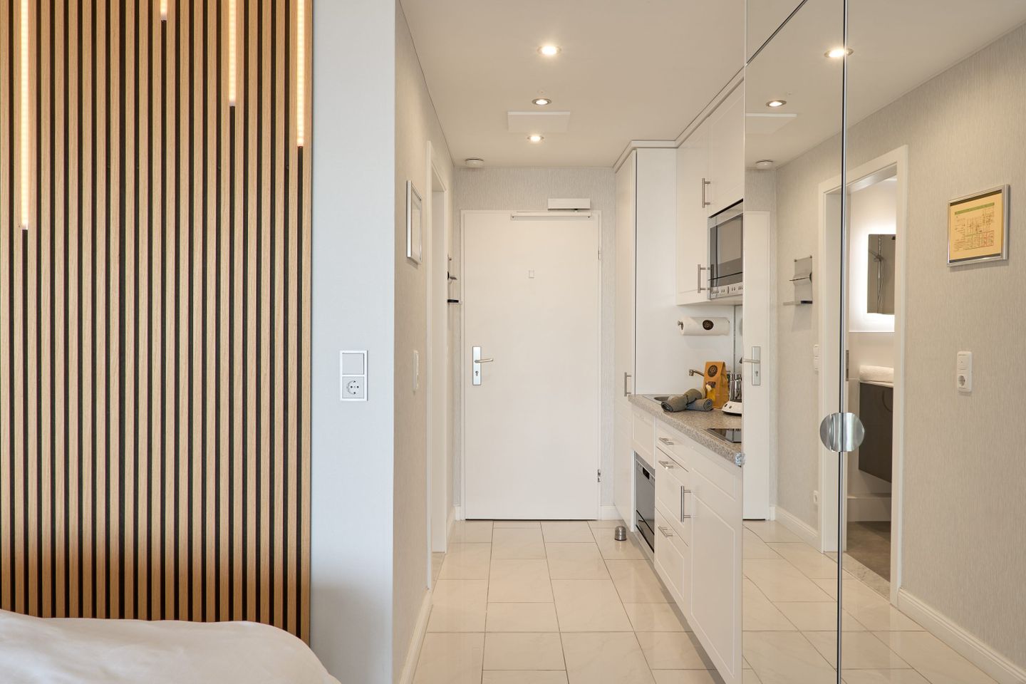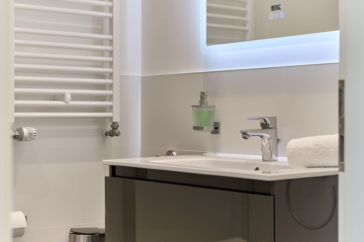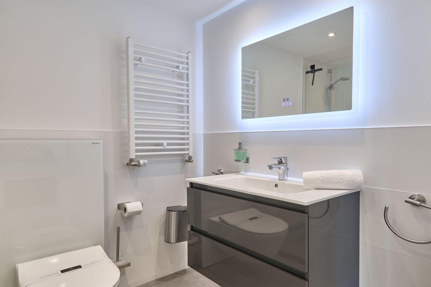 Die Wohnung verfügt über ein modernes Badezimmer, das mit hochwertigen Armaturen und eleganten Fliesen ausgestattet ist. Hier können Sie sich nach einem erlebnisreichen Tag am Strand entspannen und erfrischen.