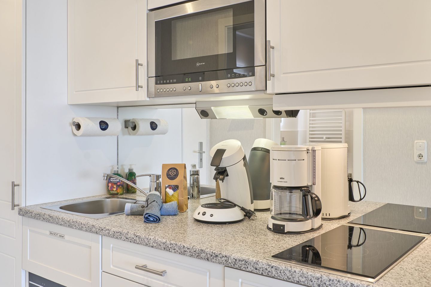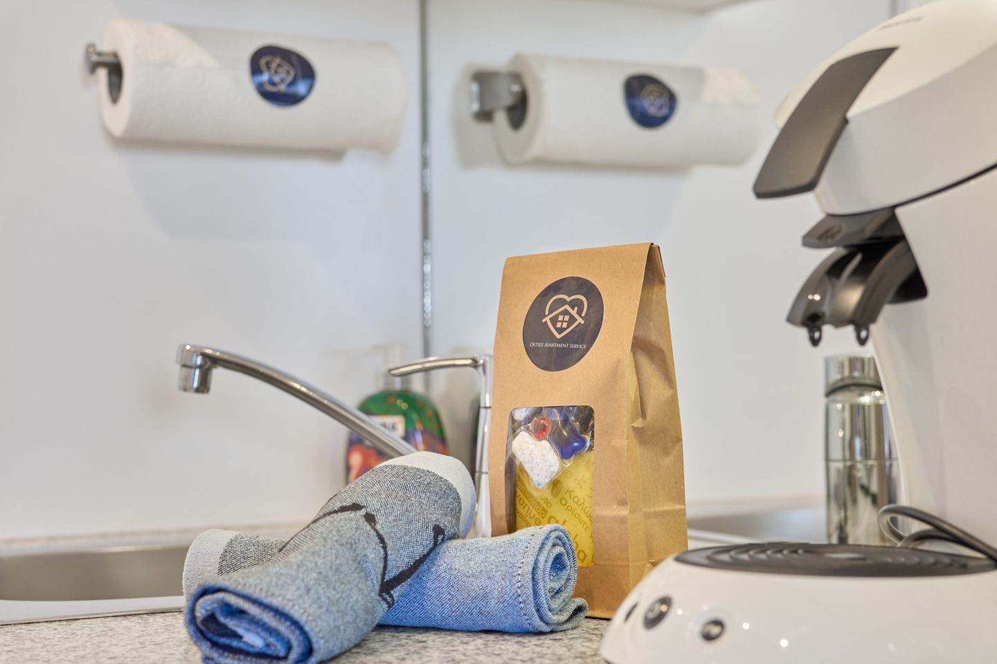 Diese beinhaltet: eine Rolle Haushaltsküchenpapier, zwei Rollen Toilettenpapier, eine kleine Flasche Spülmittel, eine Mülltüte, ein Spülschwamm, ein Spültuch, eine Handseife, zwei Geschirrhandtücher und 3 Geschirrspültabs (sofern ein Geschirrspüler zur Ausstattung der Unterkunft gehört).