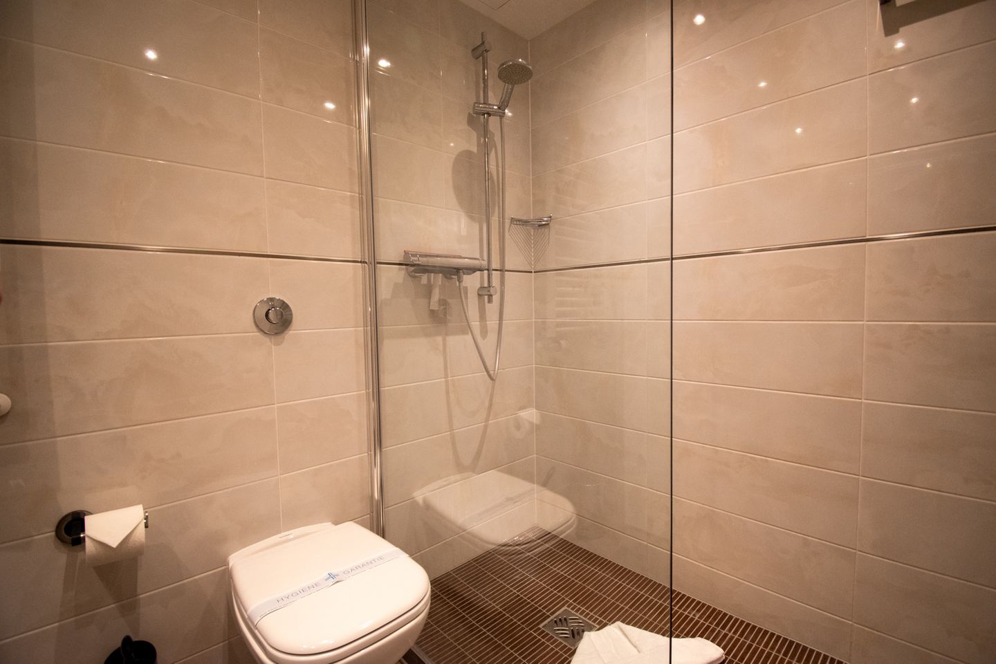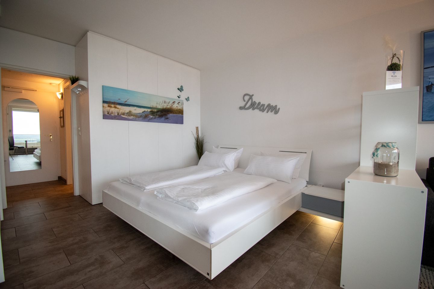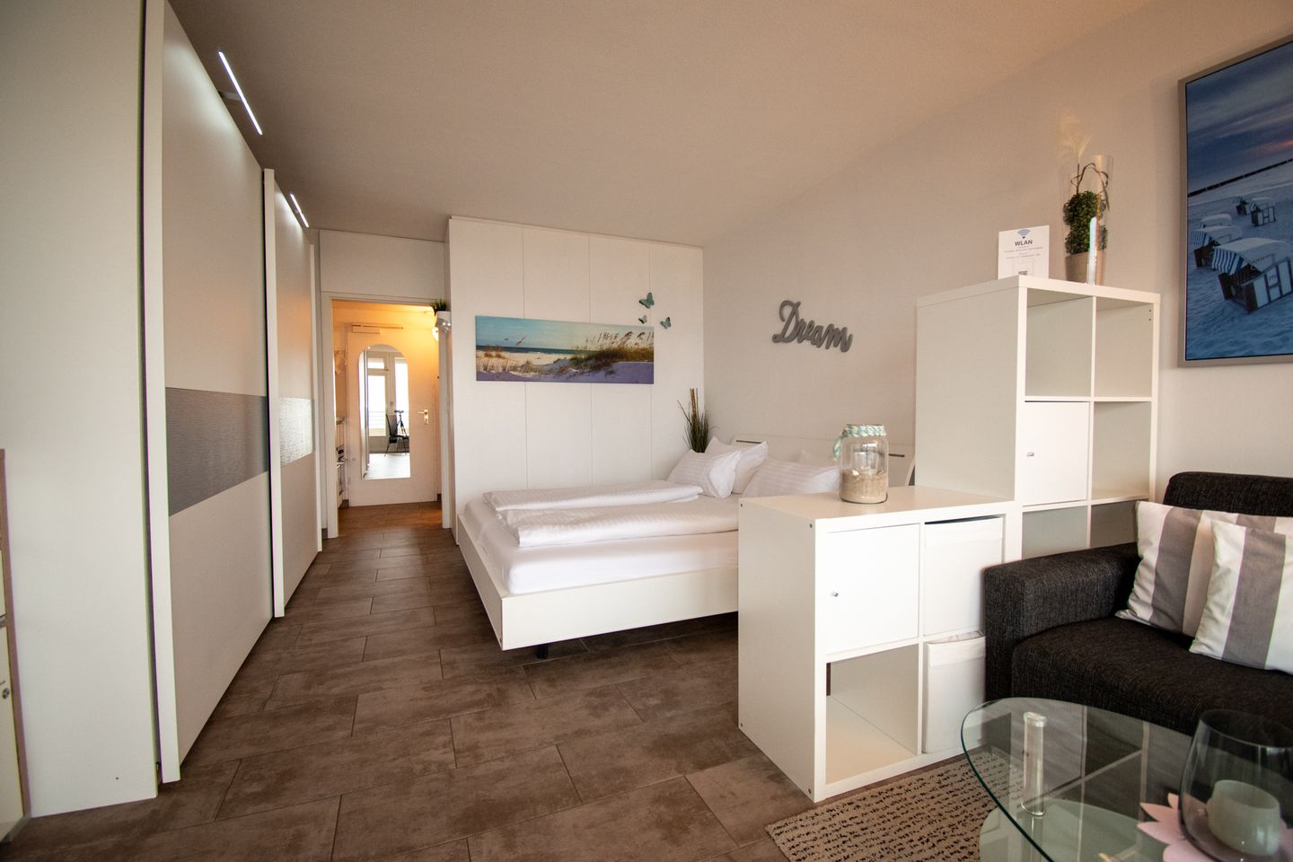 Die Wohnung verfügt über ein modernes Badezimmer, das mit hochwertigen Armaturen und eleganten Fliesen ausgestattet ist. Hier können Sie sich nach einem erlebnisreichen Tag am Strand entspannen und erfrischen.
