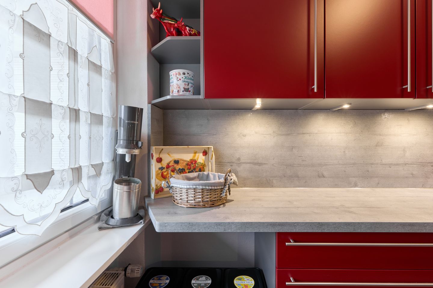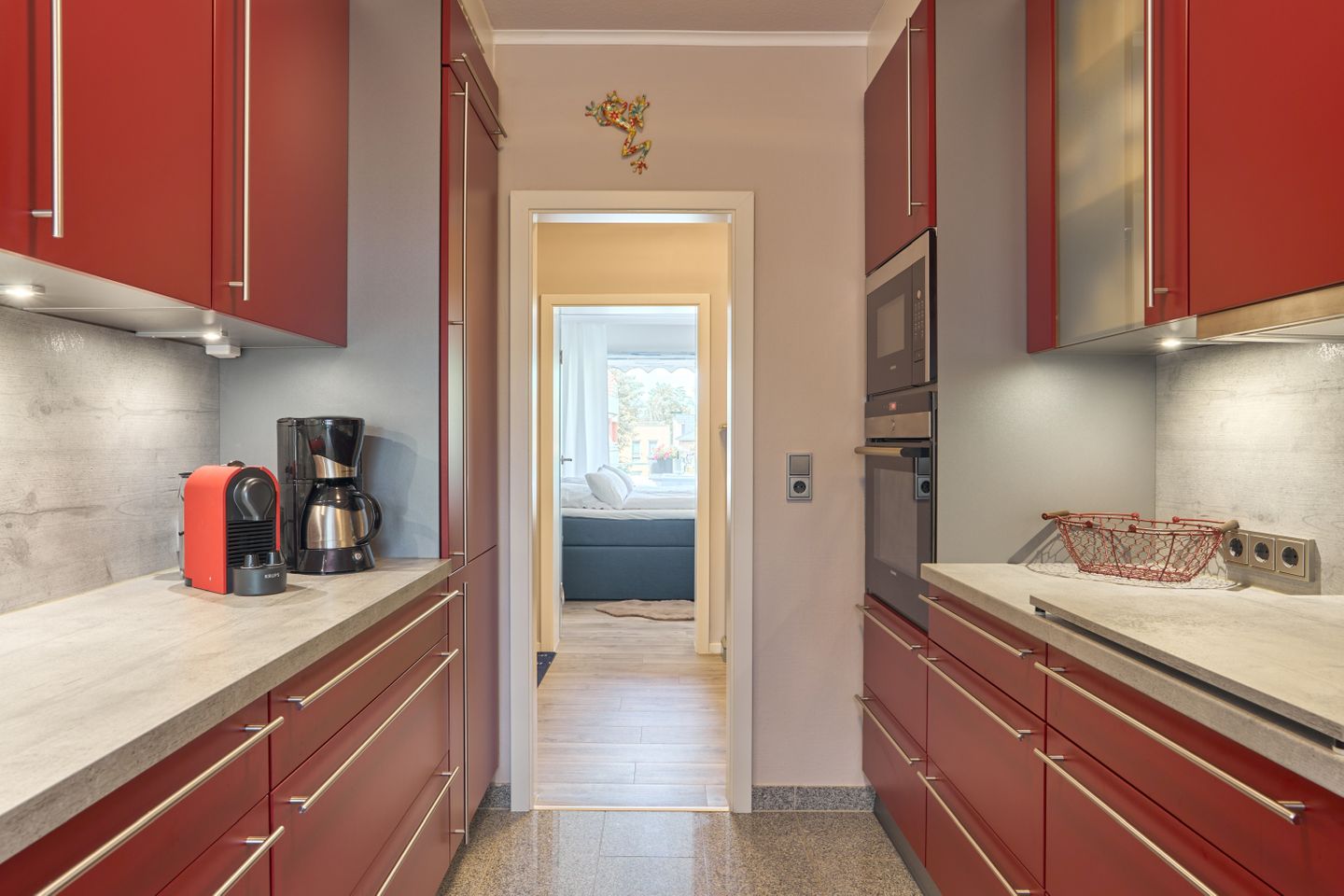 Die voll ausgestattete Küche bietet alles, was Sie für die Zubereitung Ihrer Lieblingsspeisen benötigen. Herd, Backofen, Geschirrspüler und Kühlschrank stehen zur Verfügung.