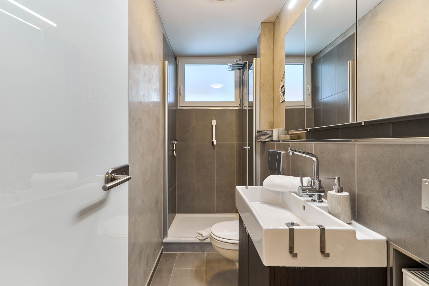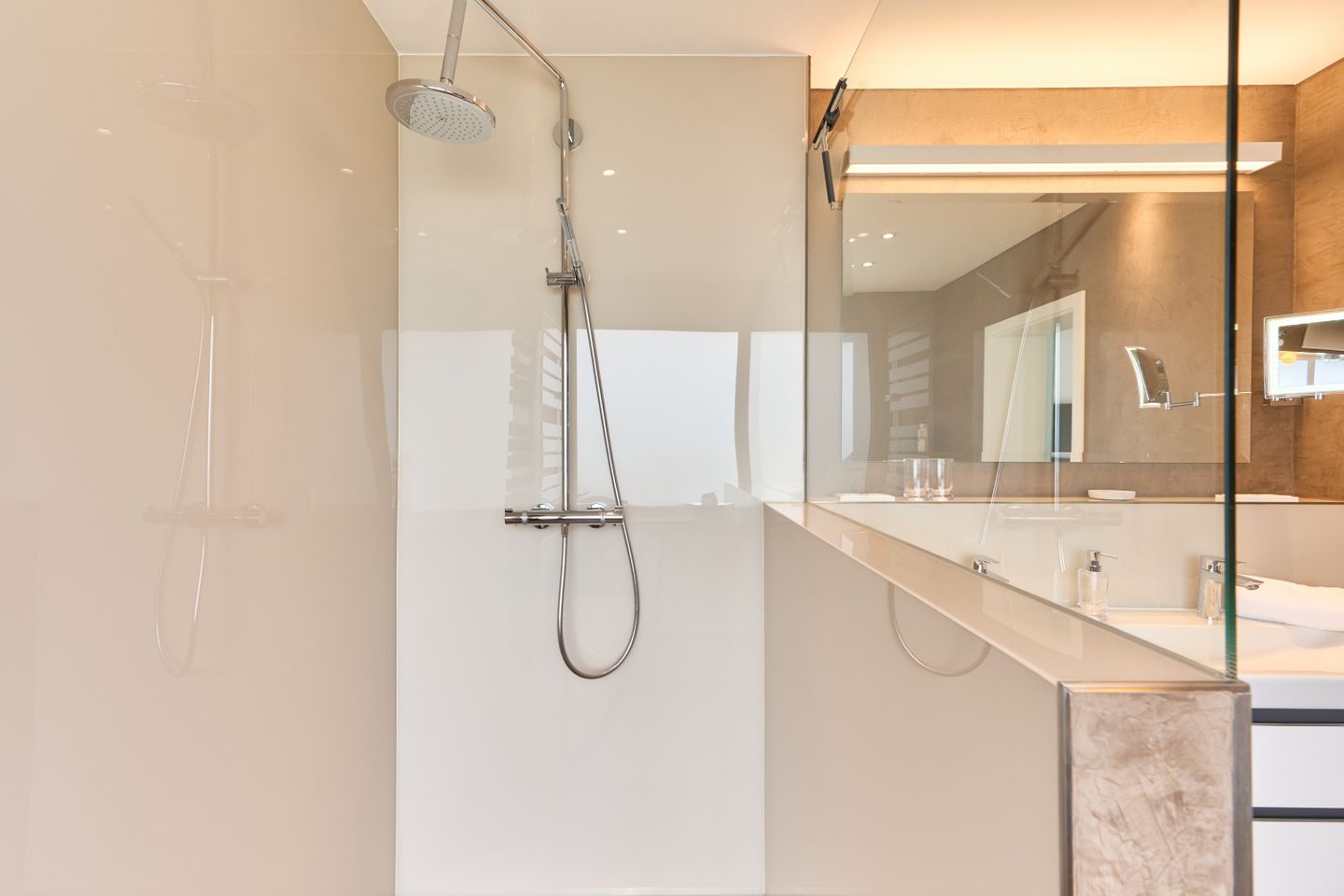 Die beiden Schlafzimmer sind komfortabel eingerichtet und bieten jeweils ein gemütliches Boxspring-Doppelbett und SmartTV`s. In den geräumigen Schränken finden Sie genügend Stauraum für Ihre persönlichen Sachen. Eines der Schlafzimmer verfügt über ein eigenes Badezimmer en-suite mit einer modernen Dusche. Das zweite Badezimmer ist ebenfalls geschmackvoll modern gestaltet und mit einer Dusche ausgestattet.