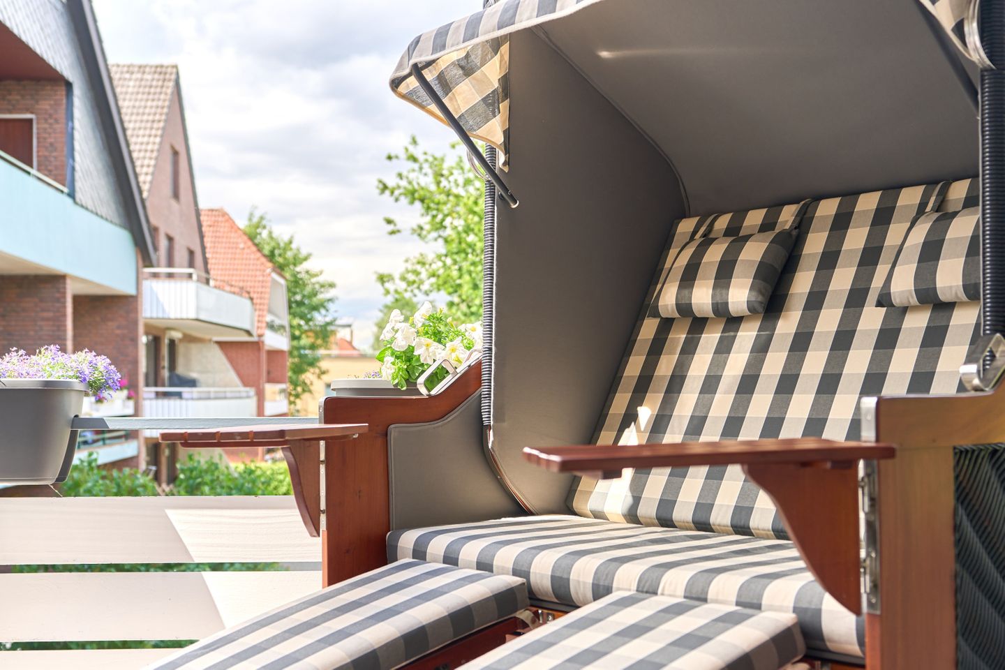 Der große Sonnenbalkon ist das Highlight des Apartments und lädt zum Entspannen und Sonnenbaden ein. Mit bequemen Stühlen, einem Esstisch und einem Strandkorb können Sie hier die frische Meeresluft und die warmen Sonnenstrahlen genießen.
