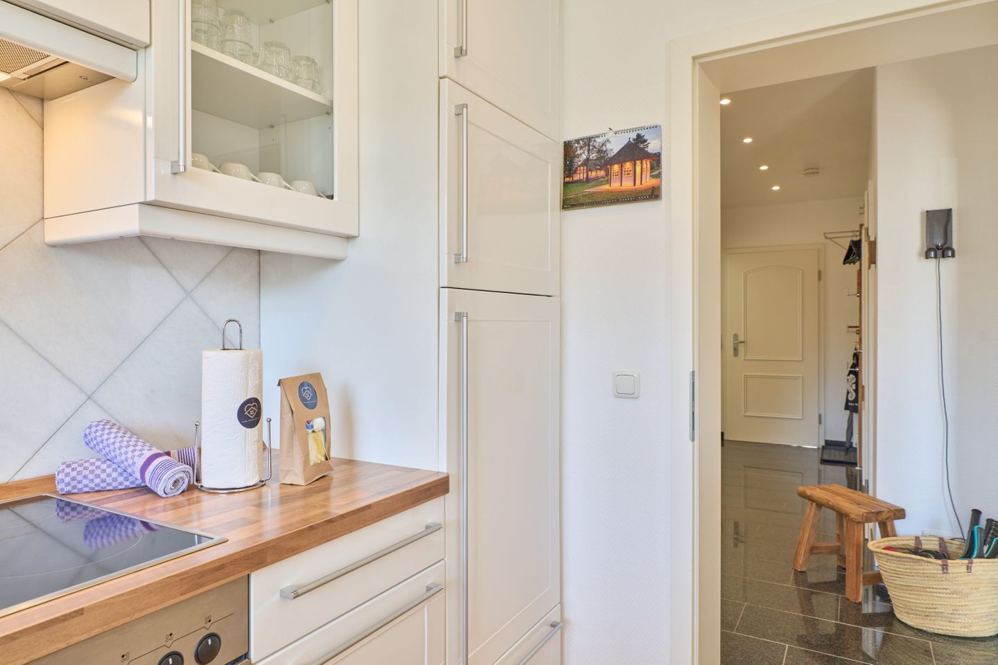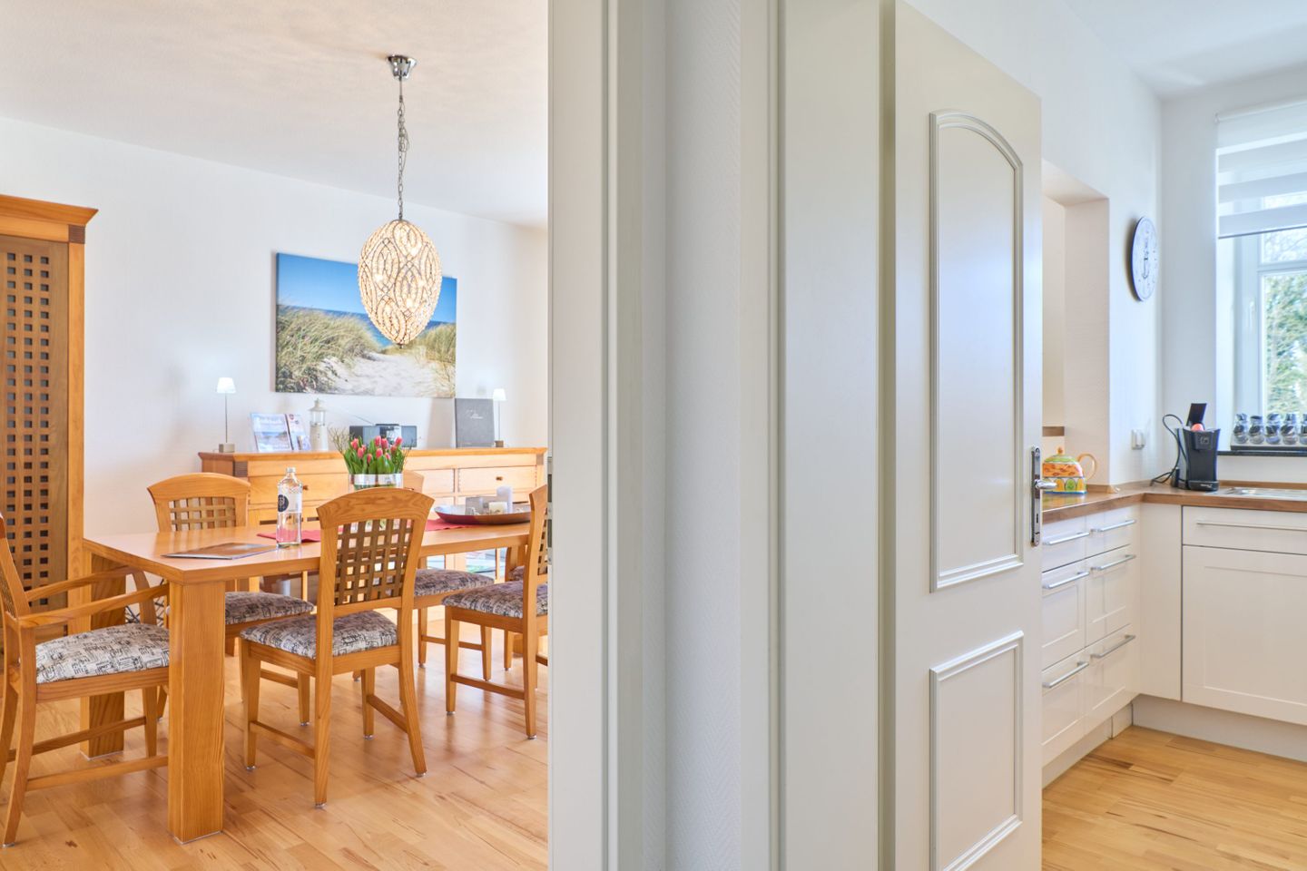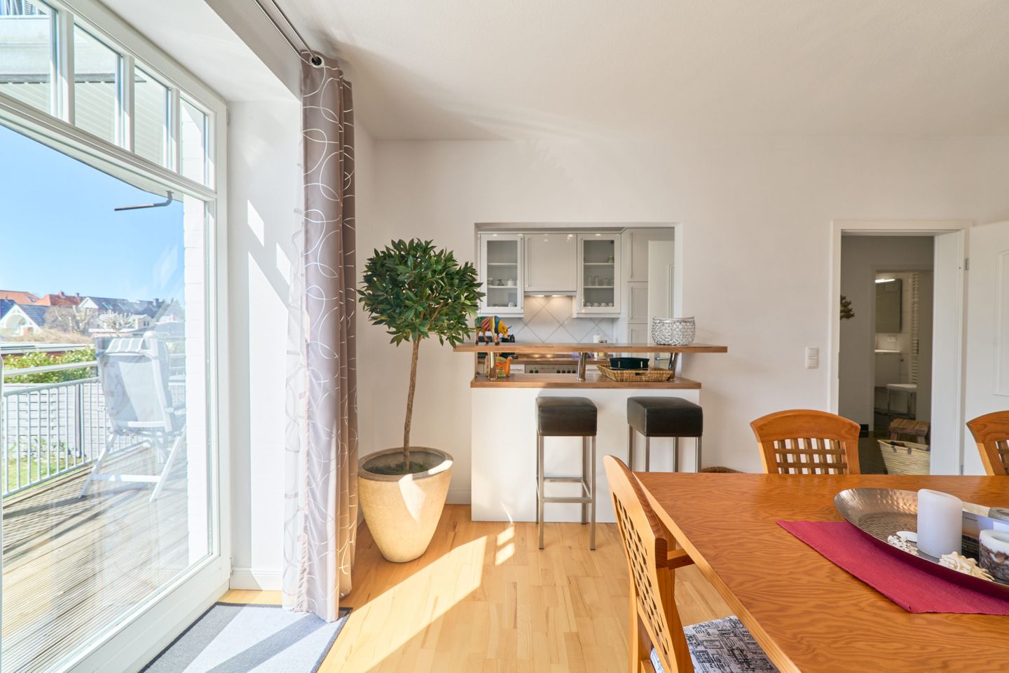 Das Herzstück der Wohnung ist der offen gestaltete Wohn- und Essbereich. Hier trifft modernes Design auf wohnliche Gemütlichkeit. Der helle Raum verbindet Kochen, Essen und Entspannen auf harmonische Weise – perfekt für gemeinsame Urlaubsmomente. Im Wohnbereich stehen Ihnen ein Smart-TV, ein BluRay-Player sowie ein Radio mit Bluetooth-Funktion zur Verfügung. Gesellschaftsspiele für verschiedene Altersgruppen sorgen für Unterhaltung bei jedem Wetter. Die offene Küche ist voll ausgestattet mit einer Filterkaffeemaschine, einer Nespresso-Kafffeemaschine, einer Special.T-Teemaschine (inkl. zwei Begrüßungstabs), einem Geschirrspüler, einer Mikrowelle sowie einer Kühl-/Gefrierkombination. Auch ein Bügeleisen mit Bügelbrett ist vorhanden.