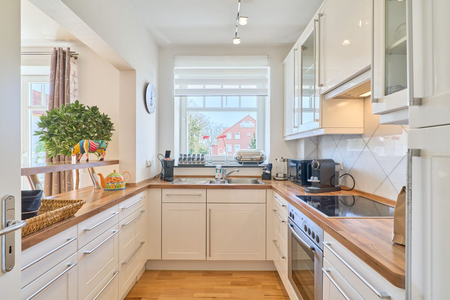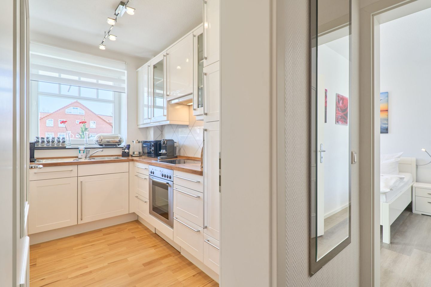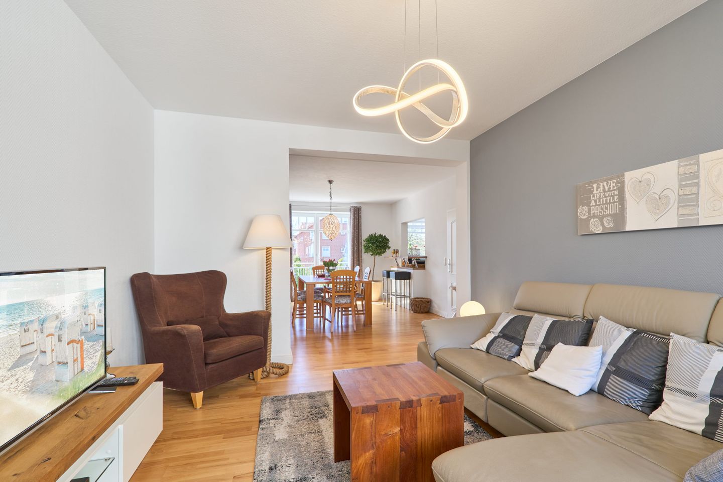 Das Herzstück der Wohnung ist der offen gestaltete Wohn- und Essbereich. Hier trifft modernes Design auf wohnliche Gemütlichkeit. Der helle Raum verbindet Kochen, Essen und Entspannen auf harmonische Weise – perfekt für gemeinsame Urlaubsmomente. Im Wohnbereich stehen Ihnen ein Smart-TV, ein BluRay-Player sowie ein Radio mit Bluetooth-Funktion zur Verfügung. Gesellschaftsspiele für verschiedene Altersgruppen sorgen für Unterhaltung bei jedem Wetter. Die offene Küche ist voll ausgestattet mit einer Filterkaffeemaschine, einer Nespresso-Kafffeemaschine, einer Special.T-Teemaschine (inkl. zwei Begrüßungstabs), einem Geschirrspüler, einer Mikrowelle sowie einer Kühl-/Gefrierkombination. Auch ein Bügeleisen mit Bügelbrett ist vorhanden.