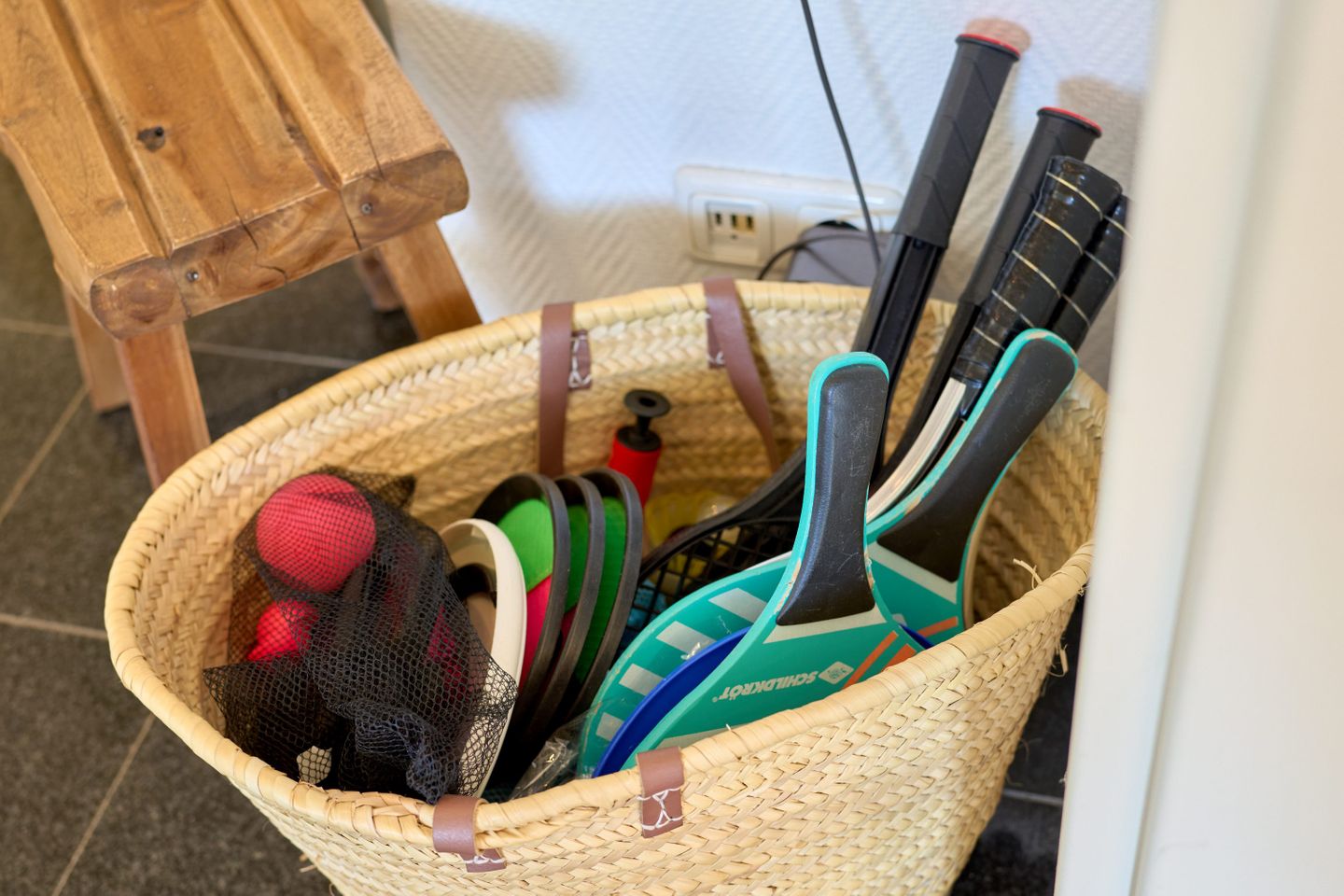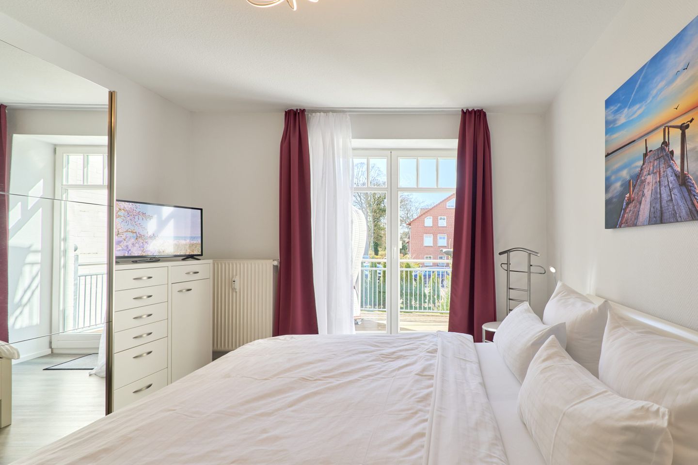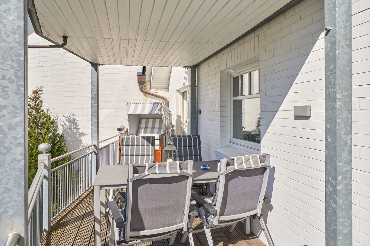 Ein besonderes Highlight ist der ruhige Südbalkon der Wohnung. Mit einem Strandkorb und bequemen Balkonmöbeln und einem Tisch ausgestattet, lädt er zum Frühstück im Sonnenschein oder zum gemütlichen Ausklang des Tages ein. Eine praktische Strandtasche, Strandspiele, ein Regenschirm und weitere nützliche Details machen Ihren Aufenthalt noch komfortabler.
