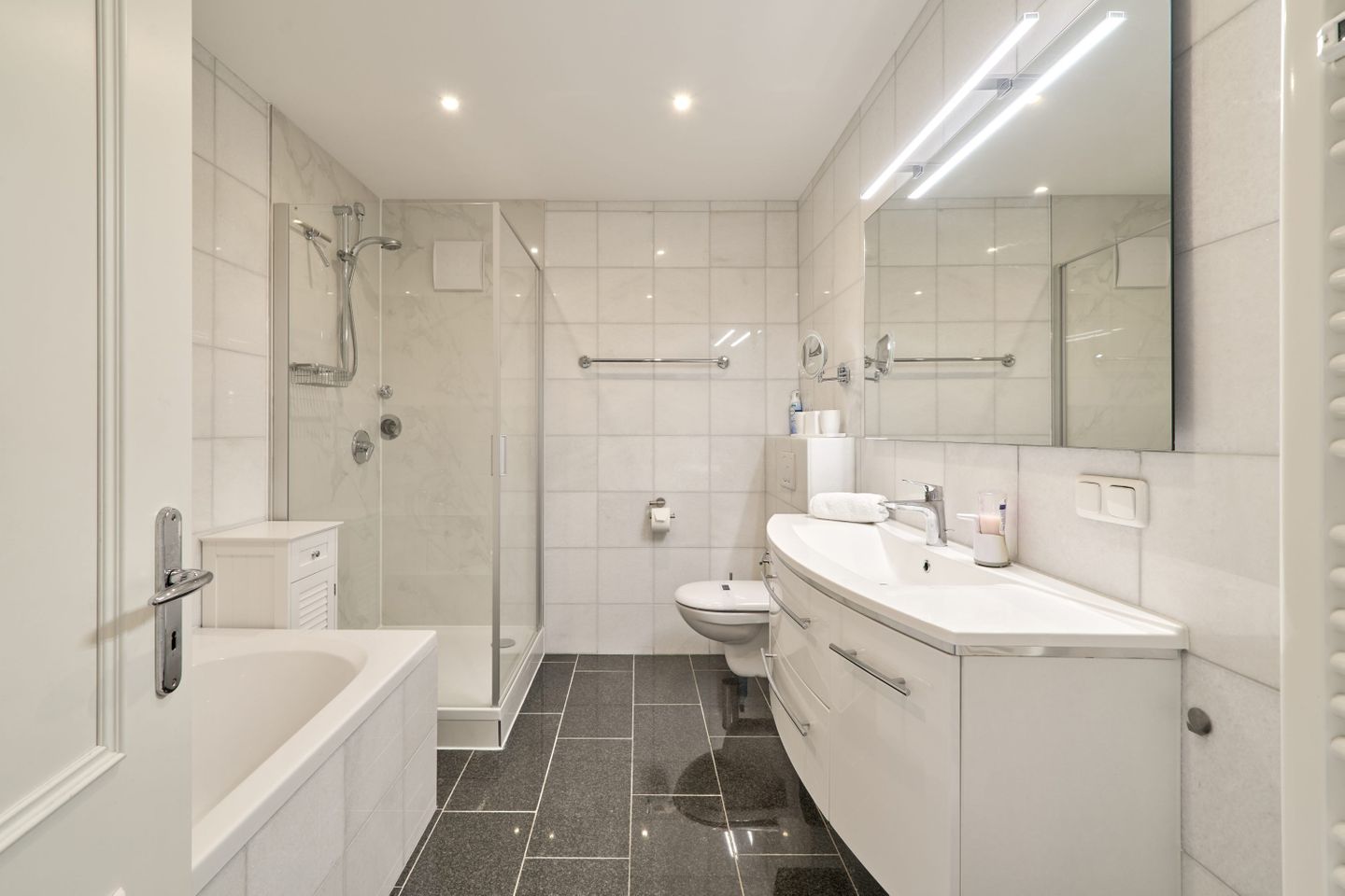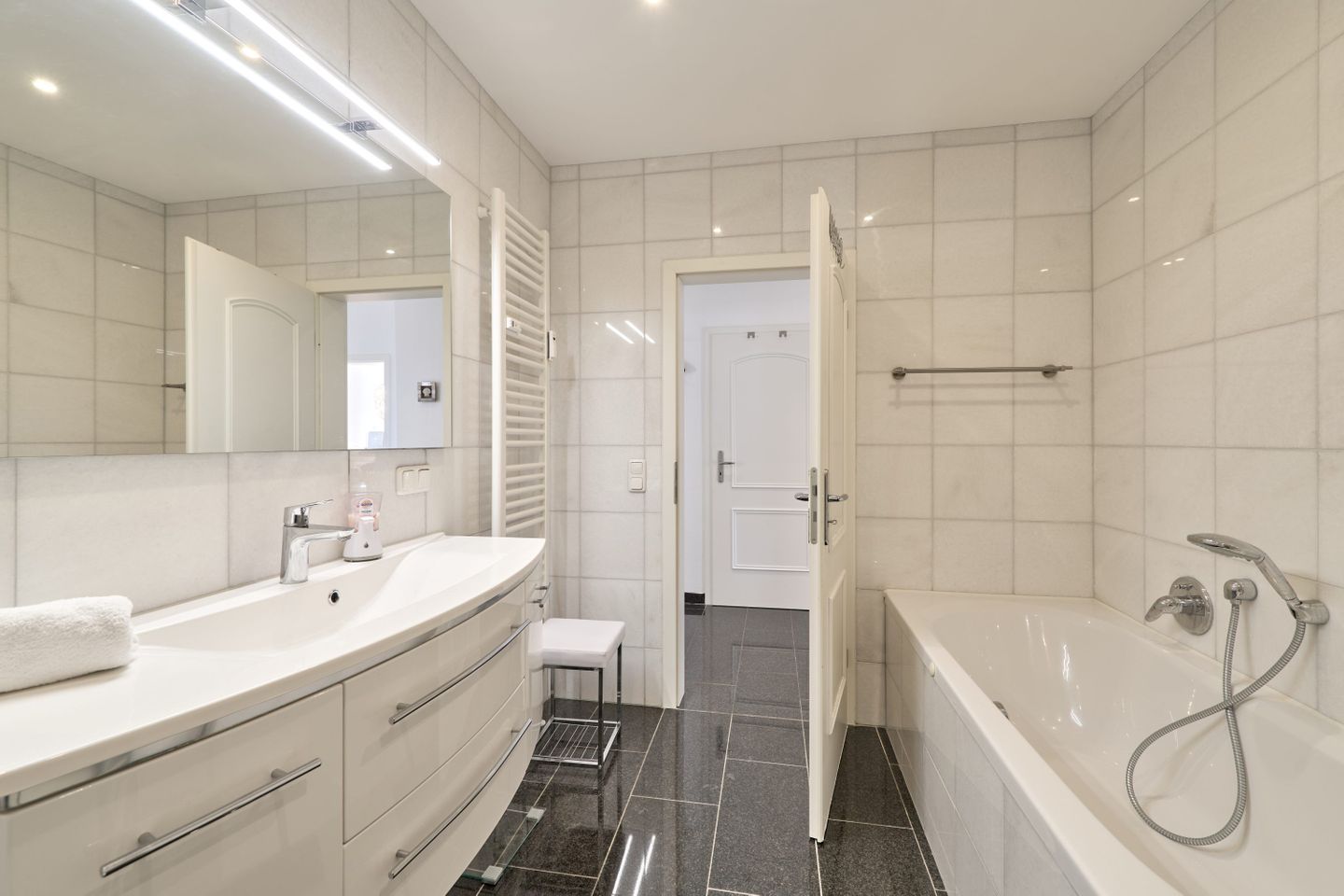 Im modern eingerichteten Badezimmer finden Sie neben einer Dusche auch eine Badewanne, eine angenehme Handtuchheizung und einen Haartrockner – ideal für einen entspannten Start in den Tag oder ein kleines Wellnessprogramm am Abend.
