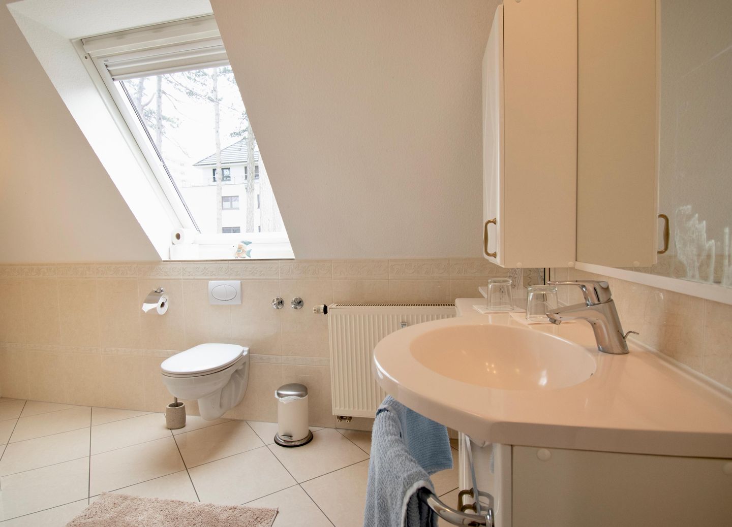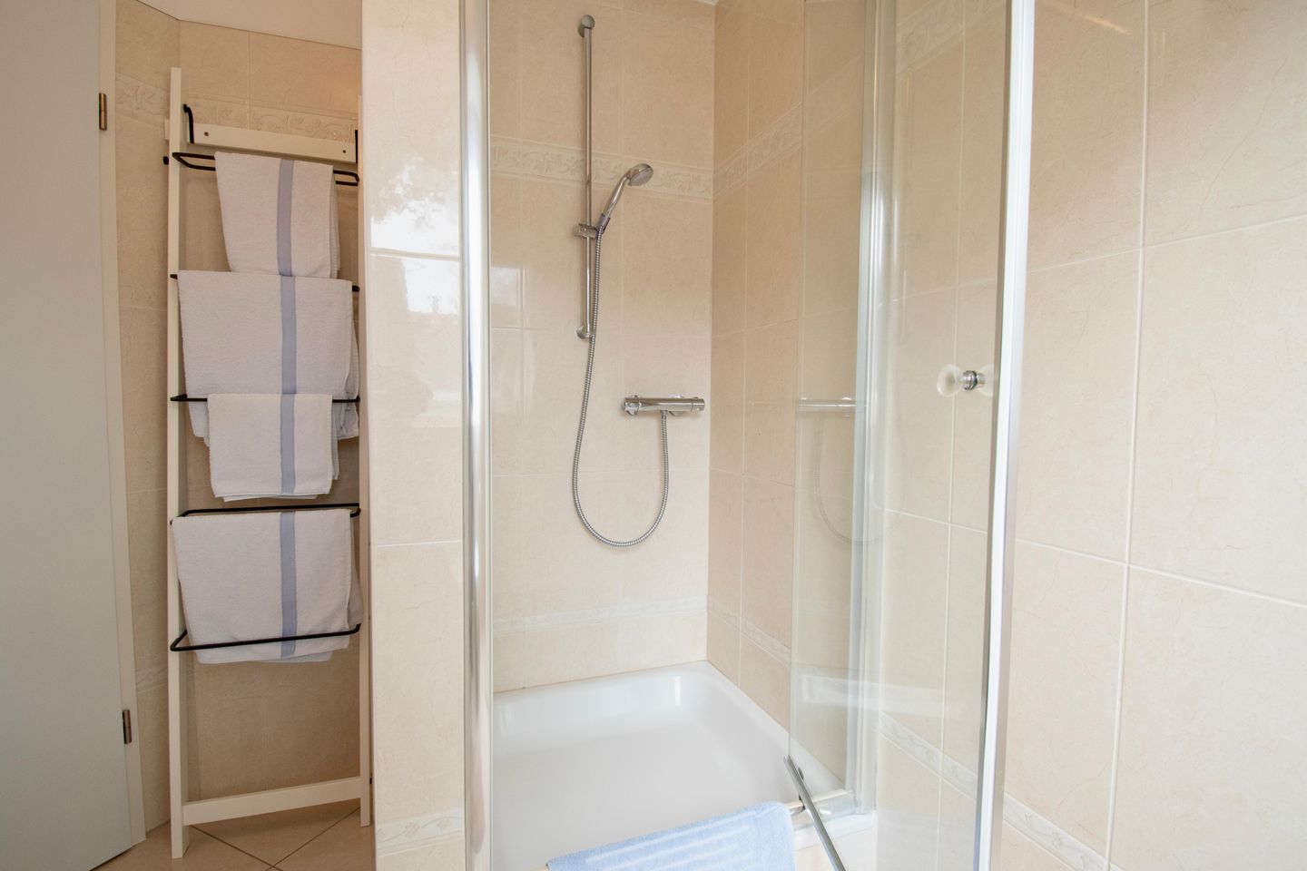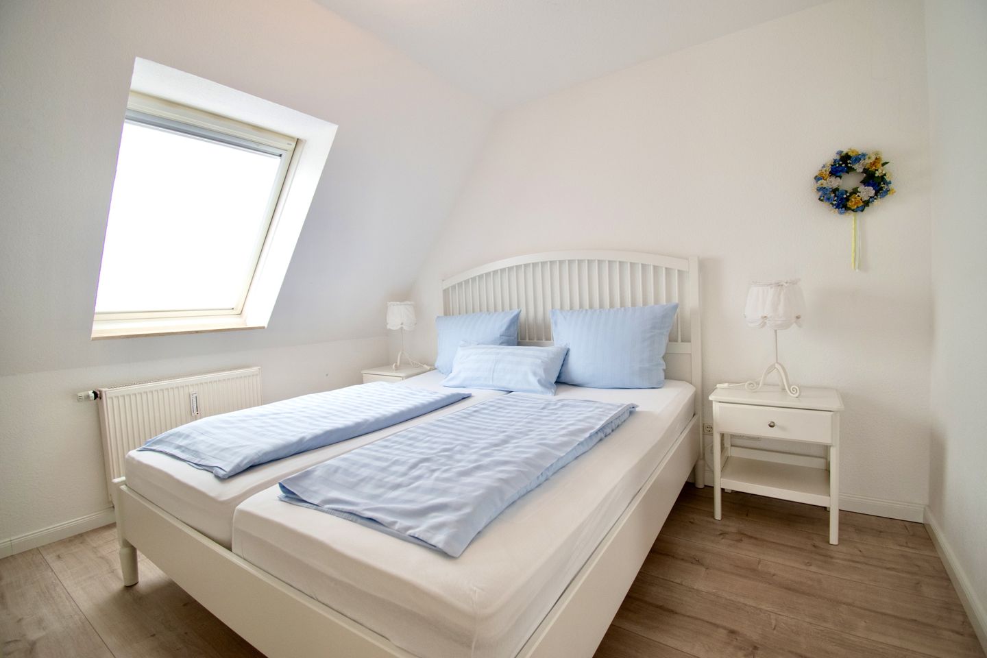Das Schlafzimmer lädt mit einem komfortablen Doppelbett zum erholsamen Schlaf ein. Im modernen Badezimmer mit einer Dusche, WC und einem großen Waschtisch können Sie sich nach einem Tag am Strand erfrischen. Handtücher liegen für Sie bereit,