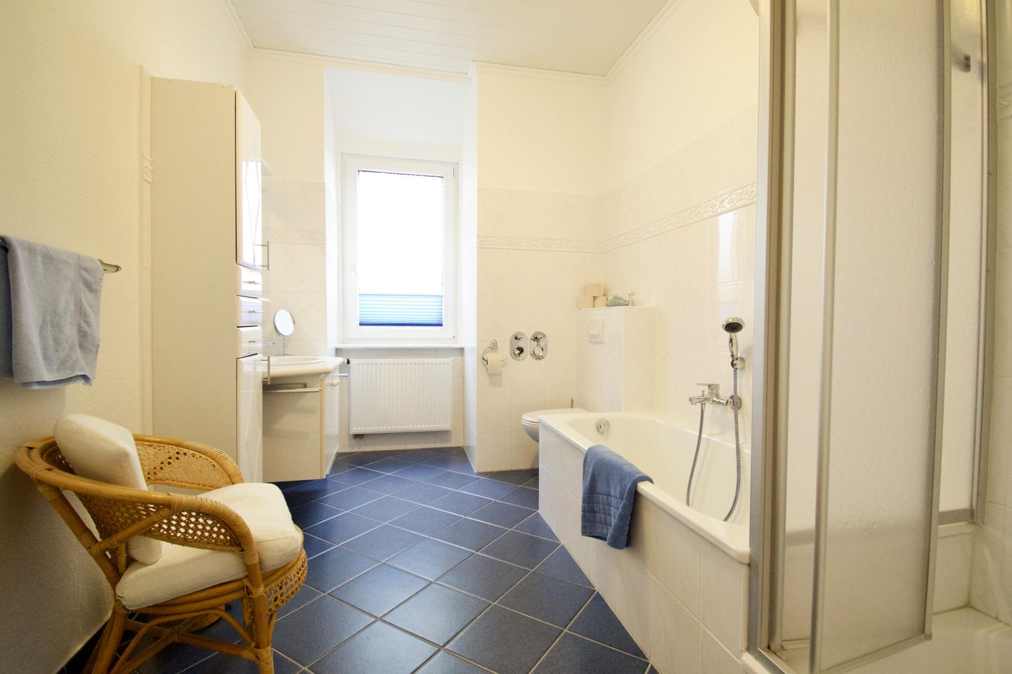 Das moderne Badezimmer ist mit einer Badewanne und einer Dusche ausgestattet, damit Sie sich nach einem Tag am Strand herrlich erfrischen können. Genießen Sie ein entspannendes Bad oder eine erfrischende Dusche und lassen Sie den Alltagsstress hinter sich.